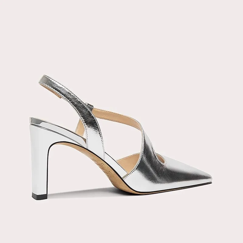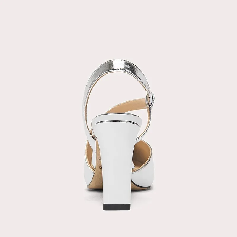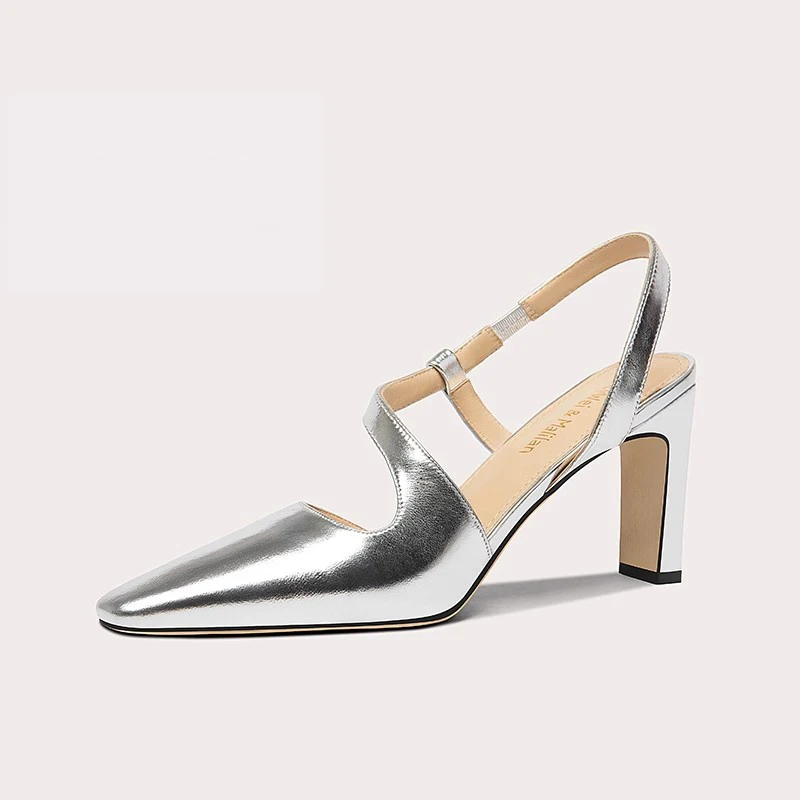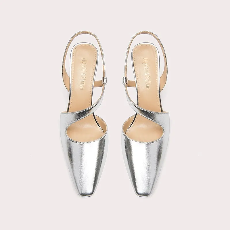 Lily Wei Women's Silver Metallic Slingback Block Heel Pumps Square Toe Cut Out Design for Formal Occasions