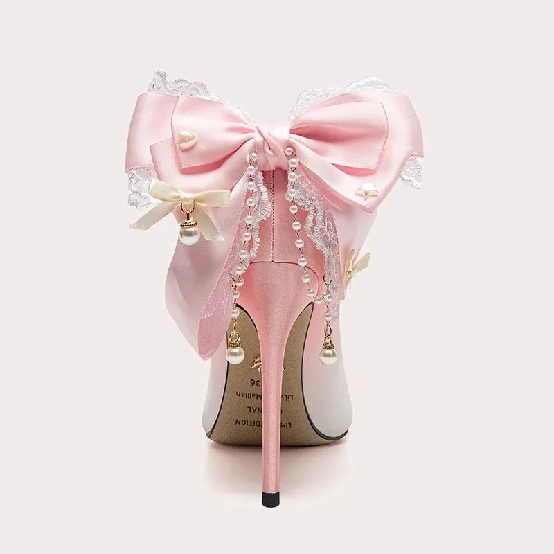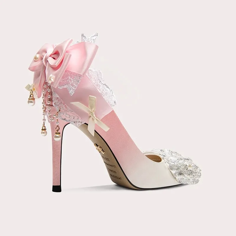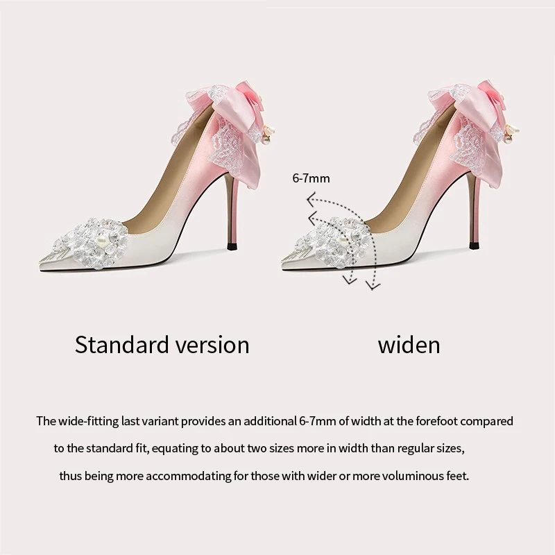 Lily Wei Pointed Toe Satin Stiletto Heels Lace With Pearl Embellishment Comfortable Padded Sole for Bridal Shoes