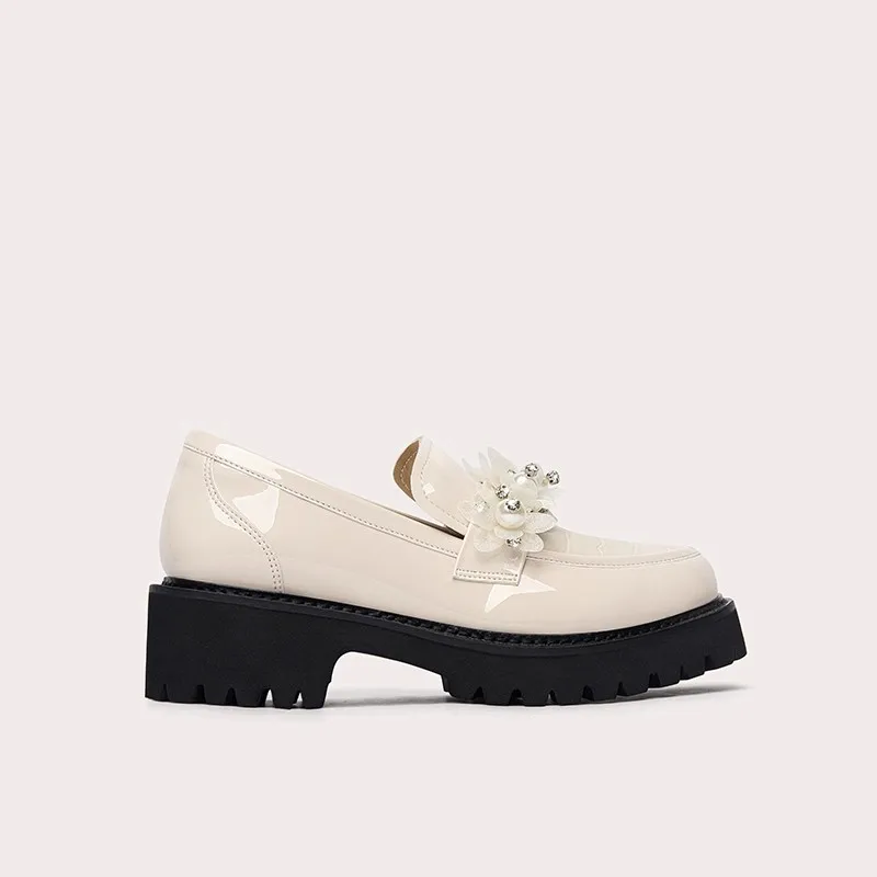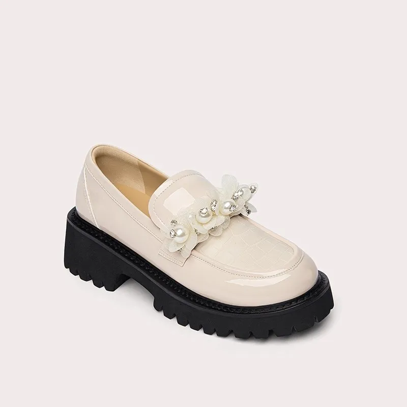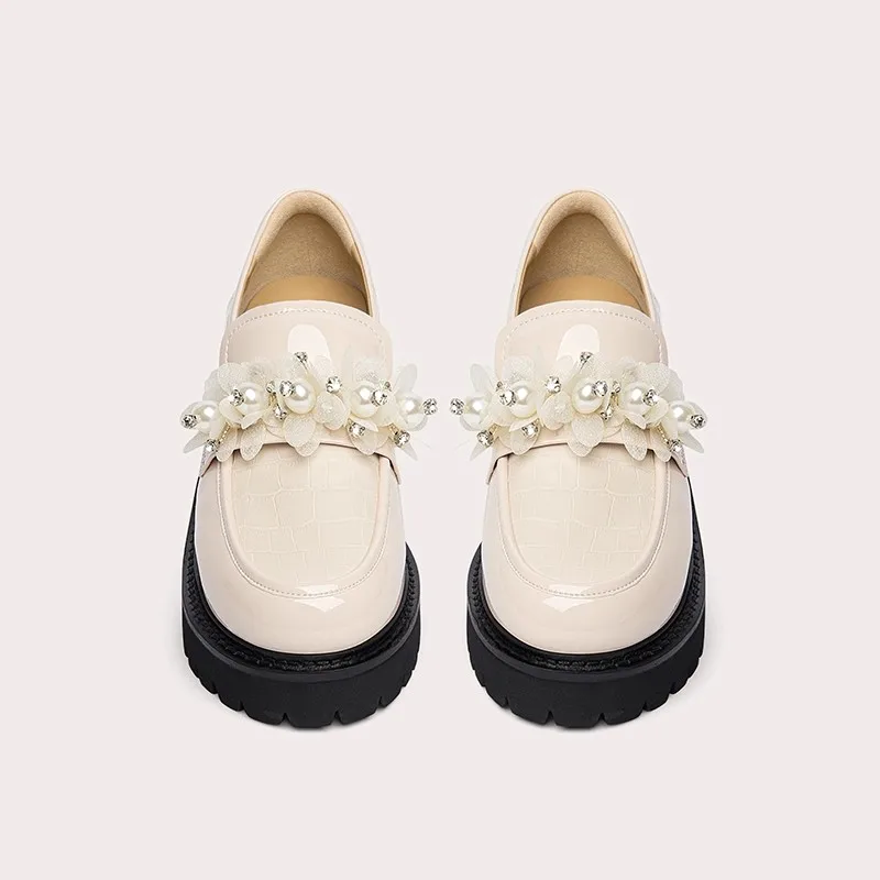 Lily Wei Elegant 6cm Chunky Sole Loafers Beige Synthetic Leather Pearl Flower Embellished Durable Sole for Daily Casual