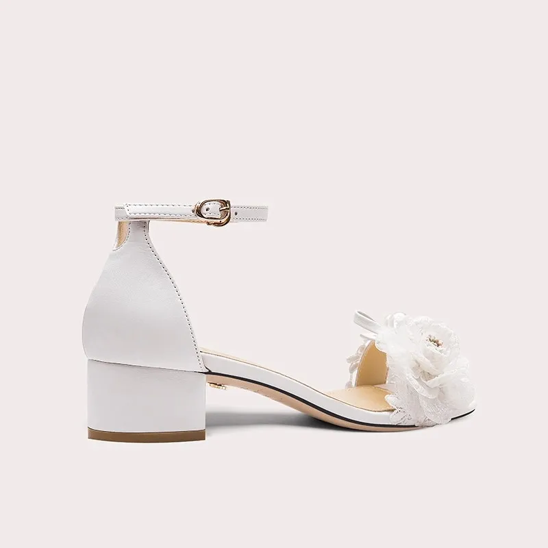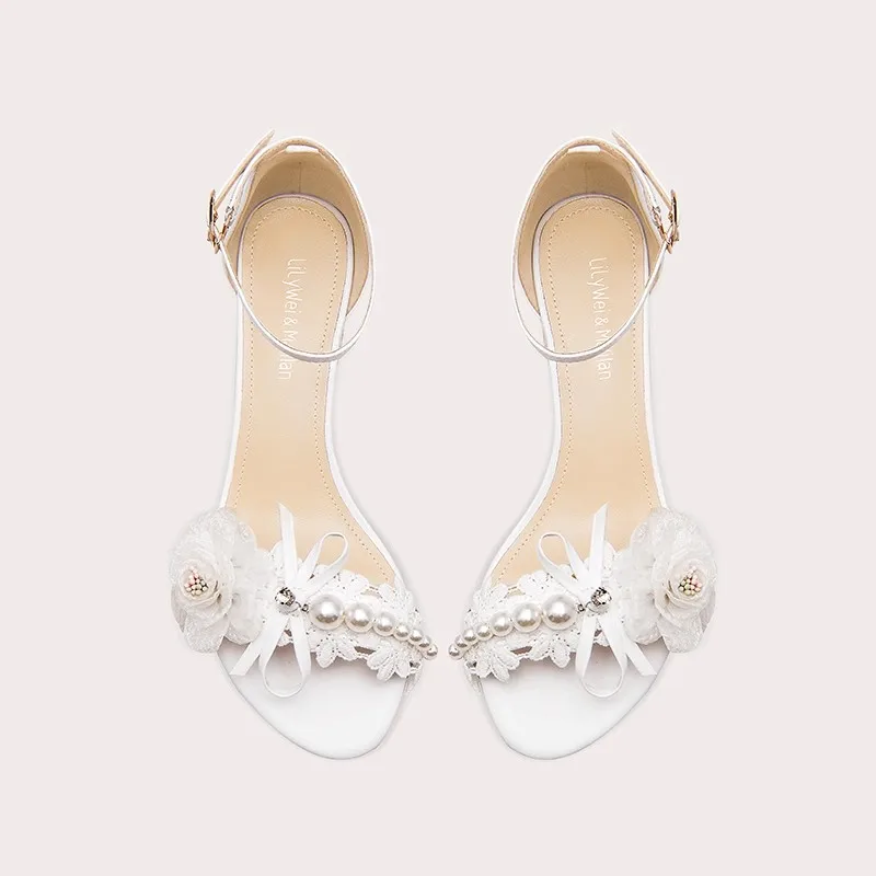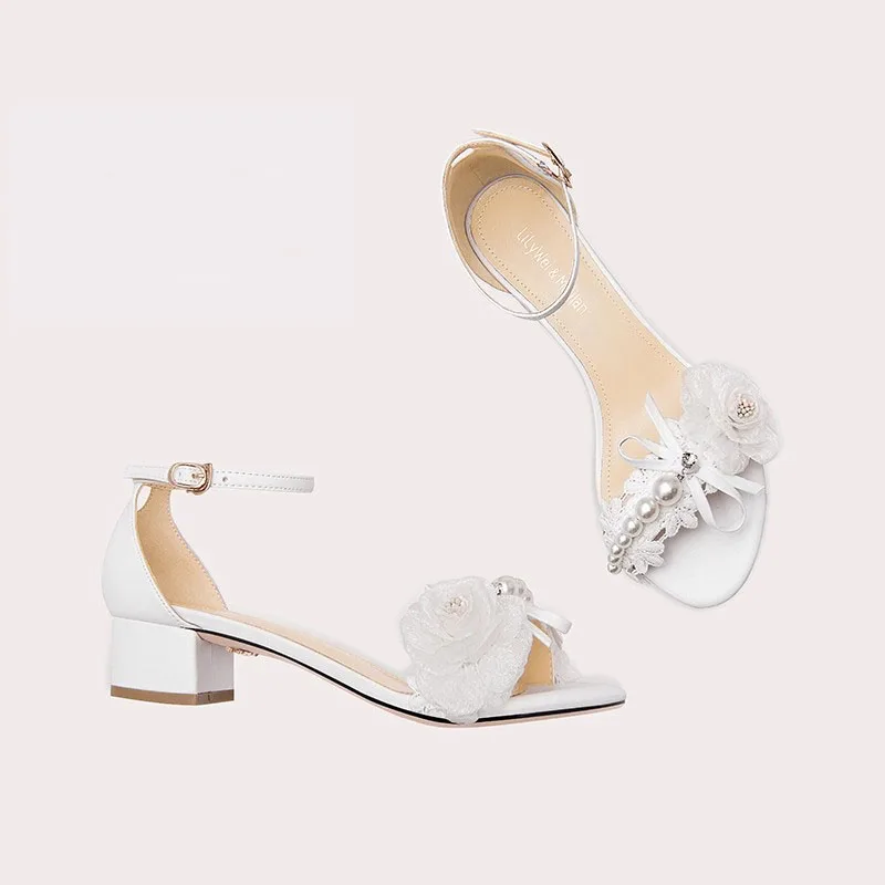 Lily Wei Floral Pearl Decor square Heel Sandals Ankle Strap Low Heel for Women's Wedding Bridal Formal Evening Event