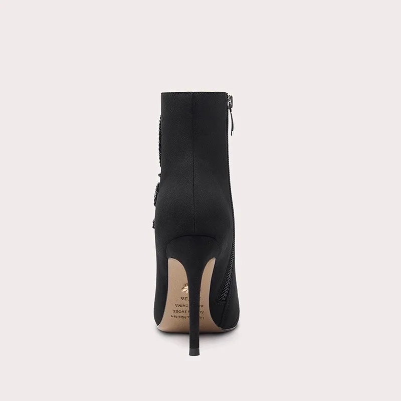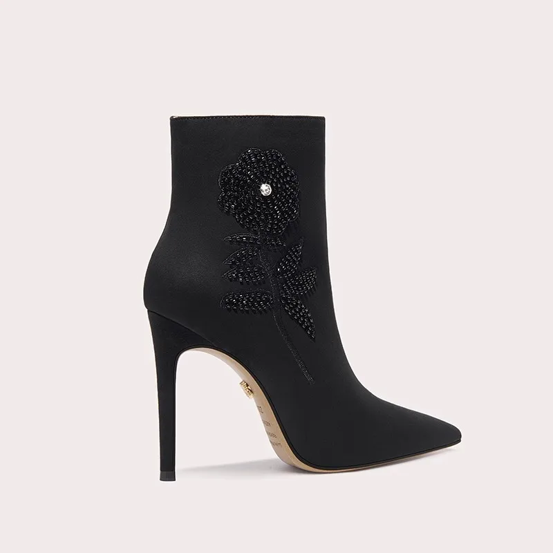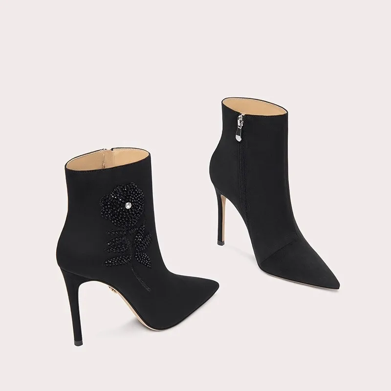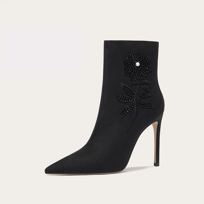 Luxury Black Ankle Boots Stiletto Fabric Shoe Upper Floral Pearl Decoration for Evening Party Commercial Women Footwear Use