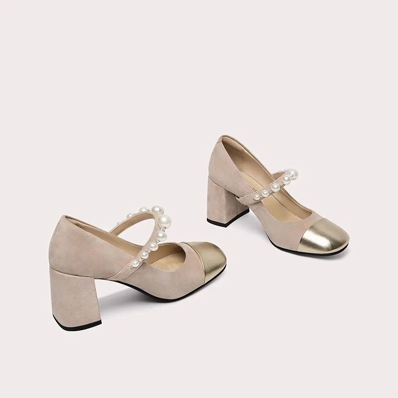 Women's Mary Jane High Heels Round Toe Thick Heel Shoes Lady Princess Party Daily Shoes Pearl One-stringed Mary Jane Shoes
