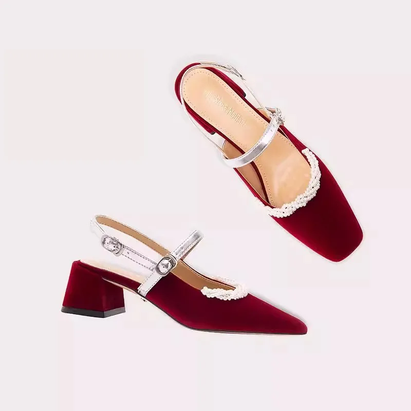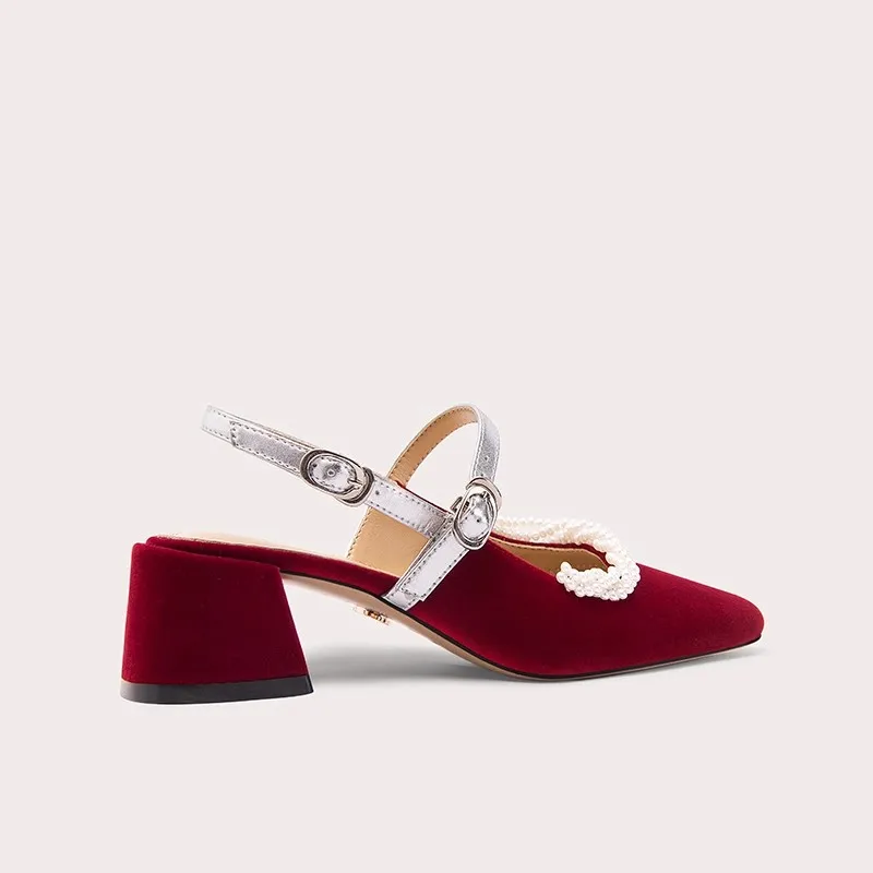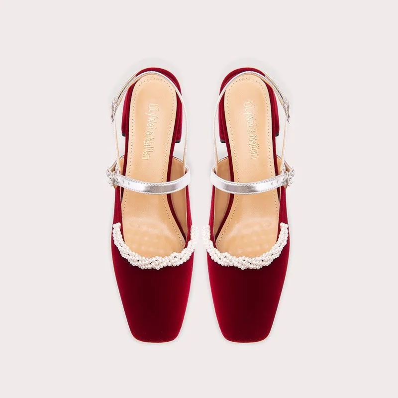 Lily Wei Slingback Women's Shoes Velvet Block Heel Pearl Square Toe for Daily Wear Women's Single Shoes
