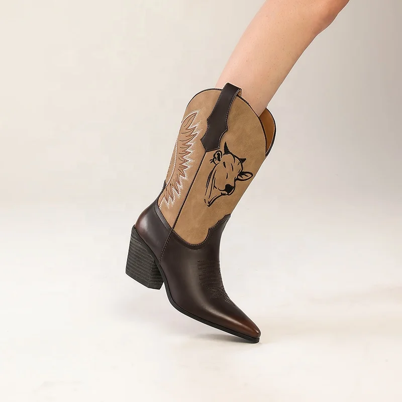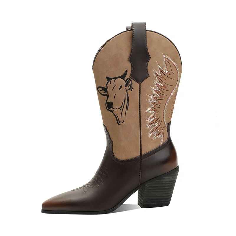 Western Cowgirl Boots with Bull Embroidery Two-Tone PU Mid-Calf Boot with Square/Pointed Toe High Heel Comfort