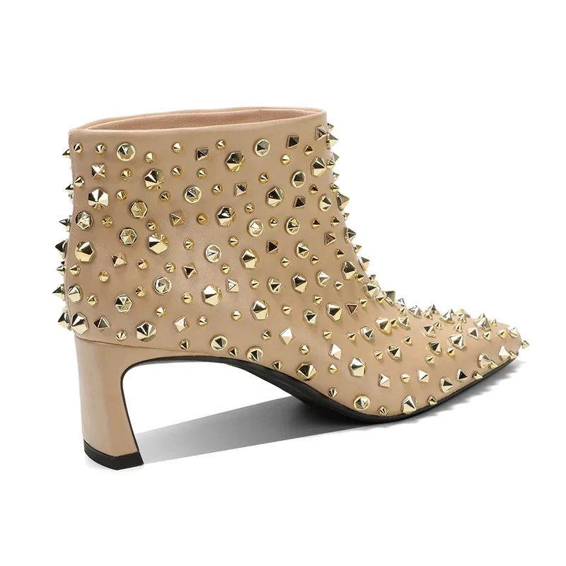 Custom Nude Ankle Boots for Women Pointed Toe Design Gold Studs Chunky Heel Height Increasing Formal Fashion Booties Wholesale