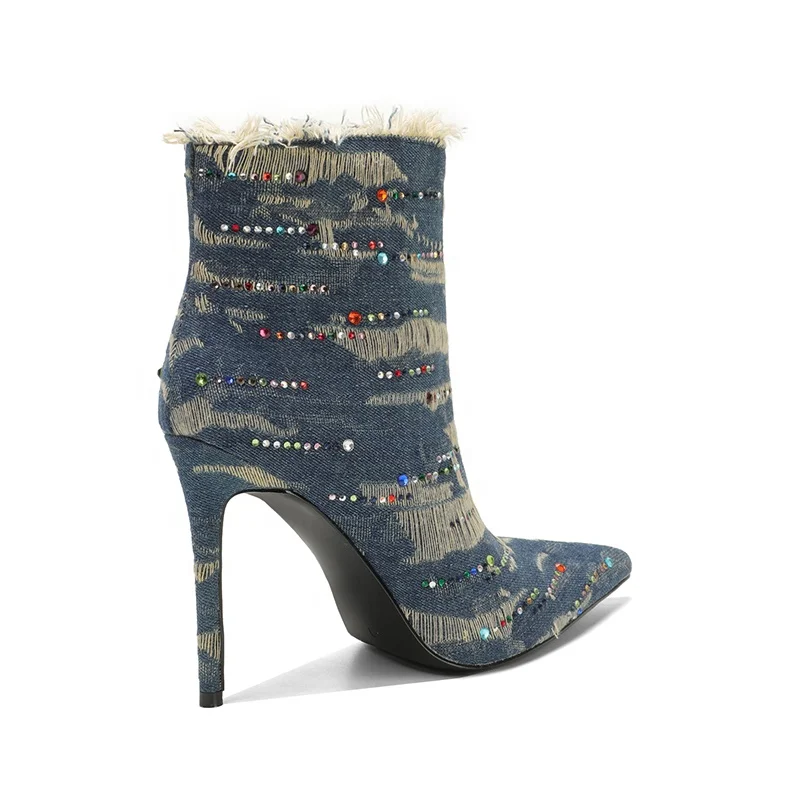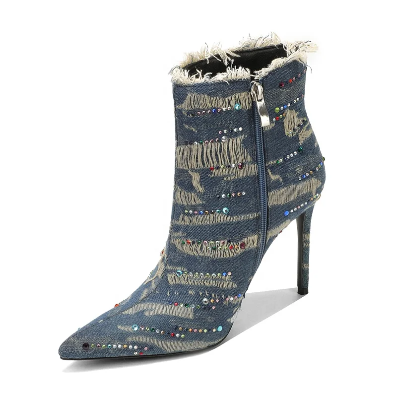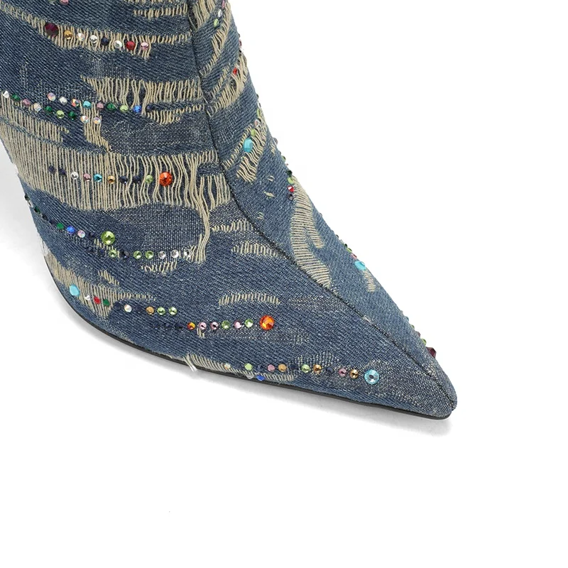Women's Stiletto Denim Embroidered Ankle Boots Zip Closure Pointed Toe Booties for Autumn/Summer Parties Western Style Buckles