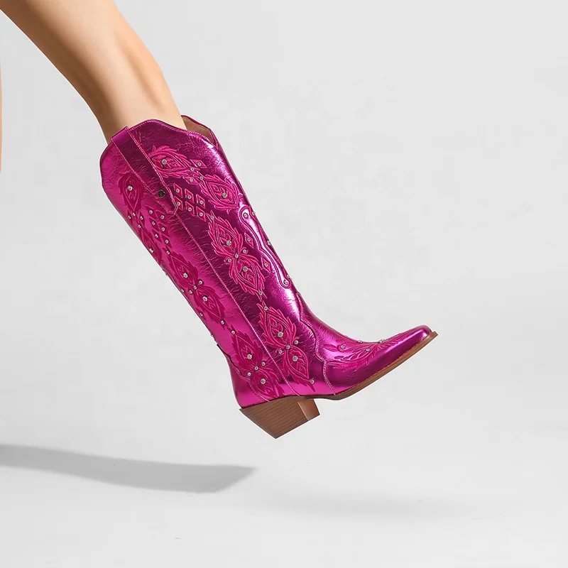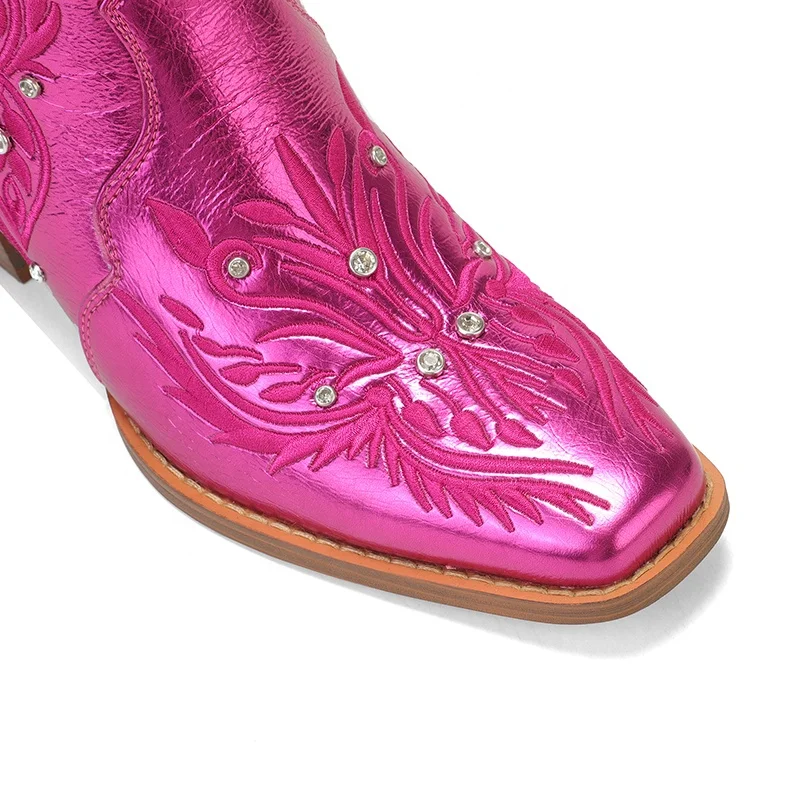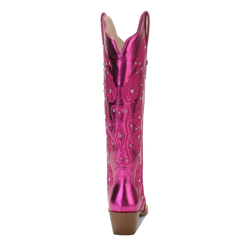 Customizable Women's Metallic Pink Embroidered Cowgirl Boots Rhinestone Studded Western Style Height Increasing Comfort Autumn