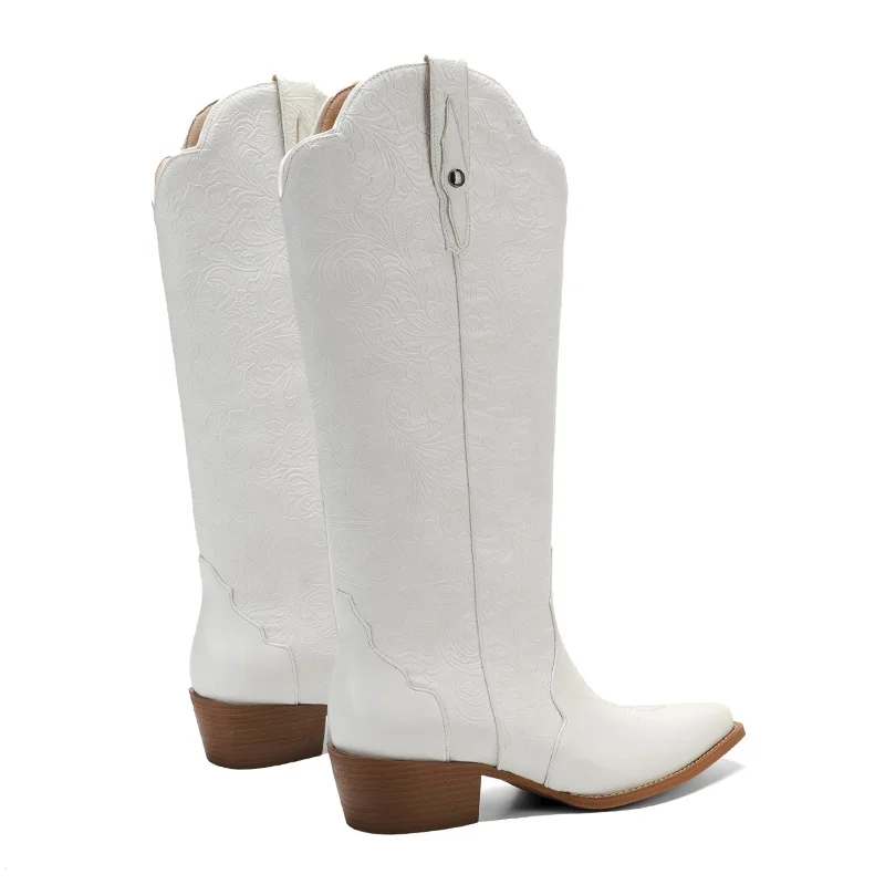 Women's Floral Embossed Western Cowboy Boots Knee-High Pointed Toe Block Heel Customizable Boots for Summer Autumn Winter