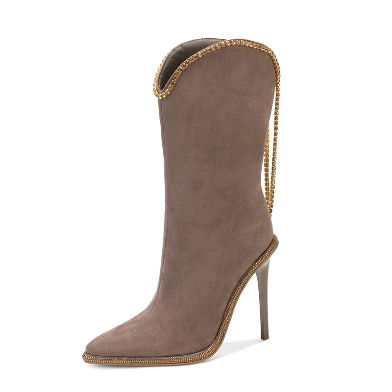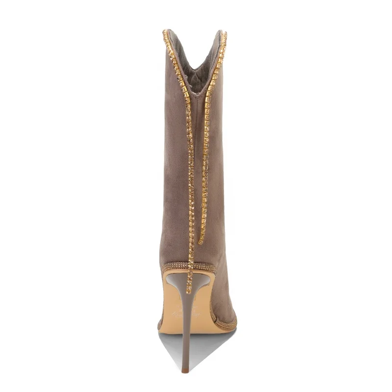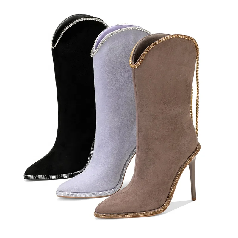 Women's Formal Fashion-Style Mid-Calf Boots Rhinestone Trim Stiletto Heel Faux Suede Upper Western Inspired Height Increasing