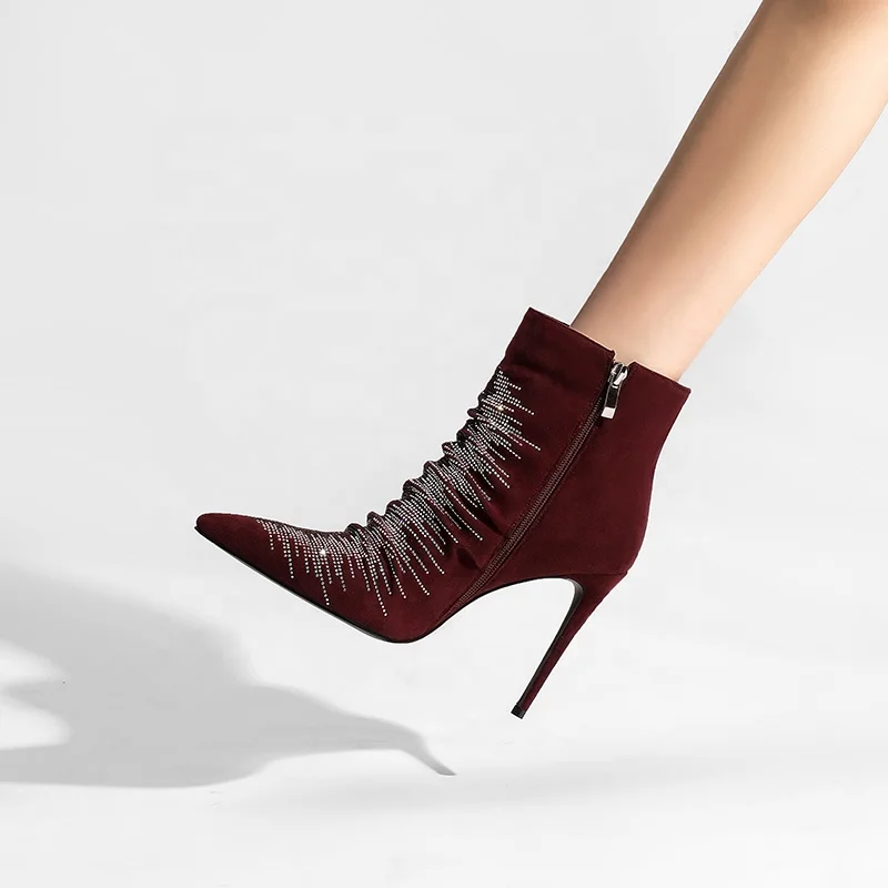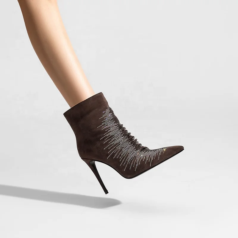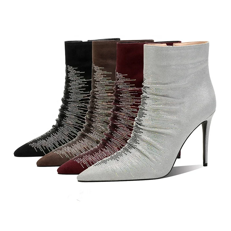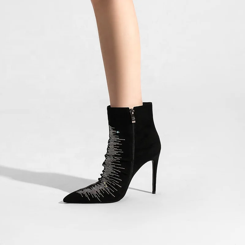 Women's Sparkly Suede Stiletto Ankle Boots Pointed Toe Formal Fashion Western Style for Fall/Winter Rhinestone Decorated Booties