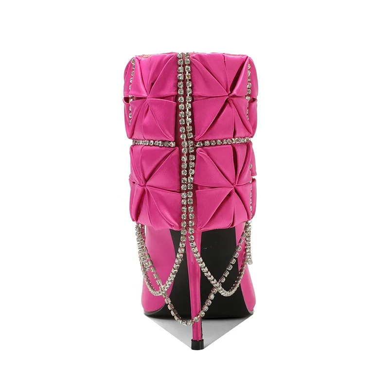 Wholesale Custom Pink Satin Ankle Boots High Heel Folded Panel Fashion Rhinestone Chains Pointed Toe Western for Summer Autumn