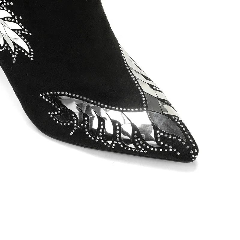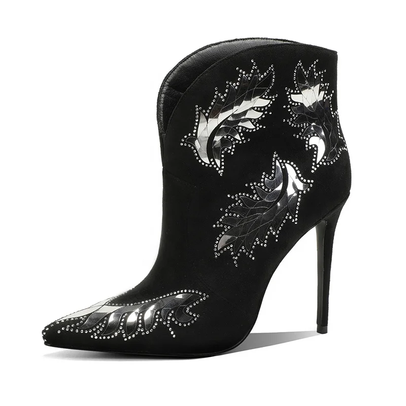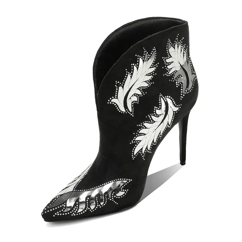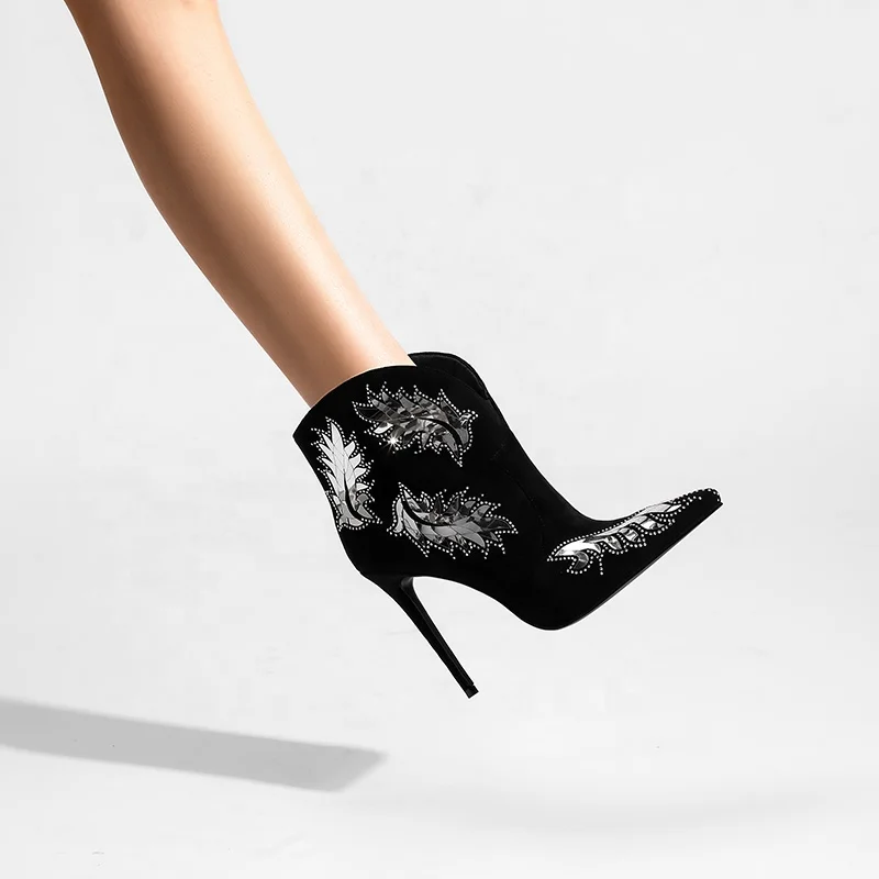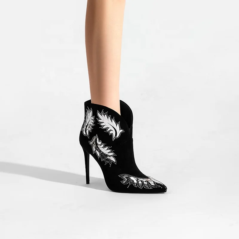 Women's Stiletto Ankle Boots with Embroidered Mirror Leaf Pointed Toe Booties for Party Western Style for Ladies