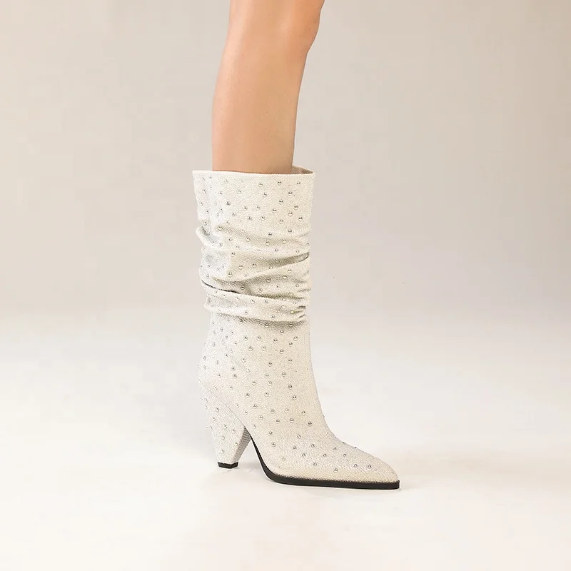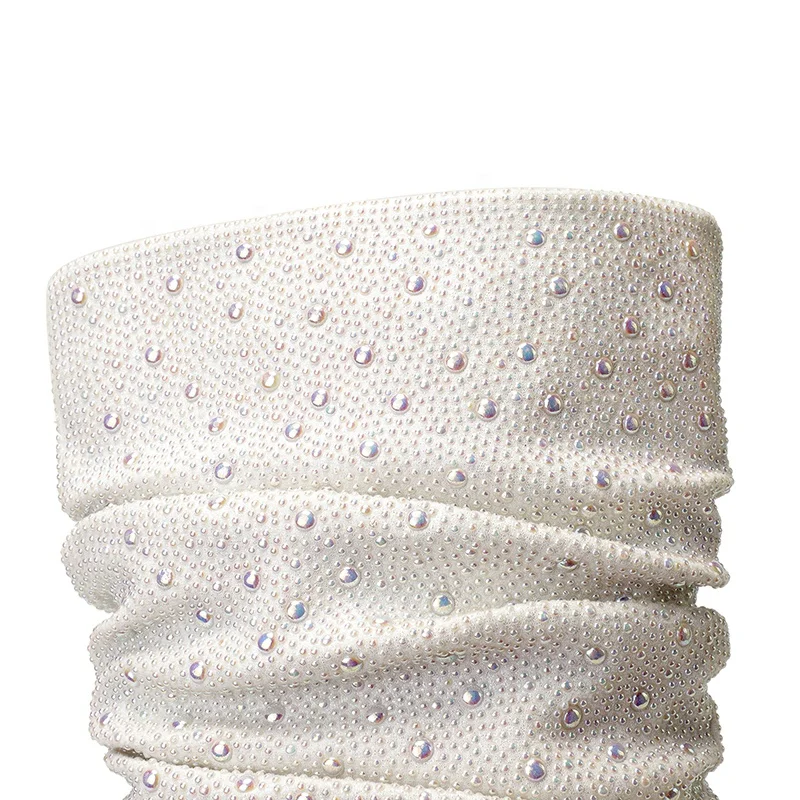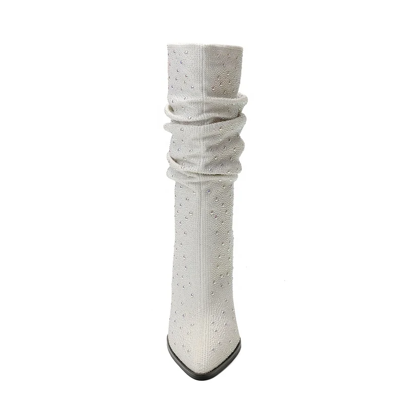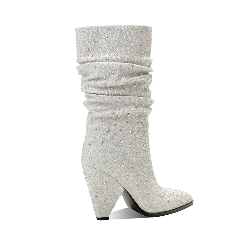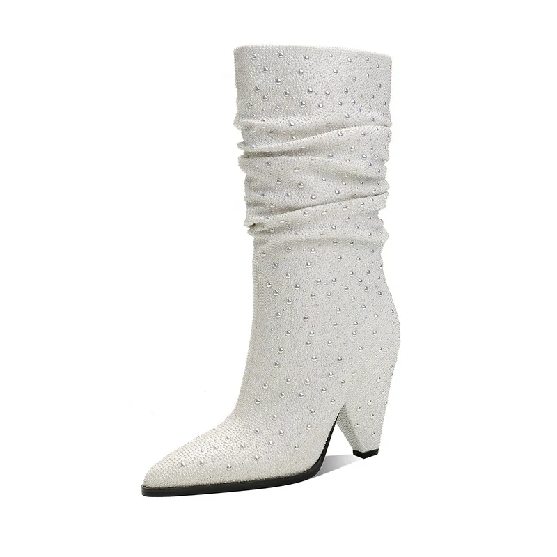 White Rhinestone Pointed Toe Knee-High Western Party Boots with 9.5cm High Heel Autumn Winter Summer