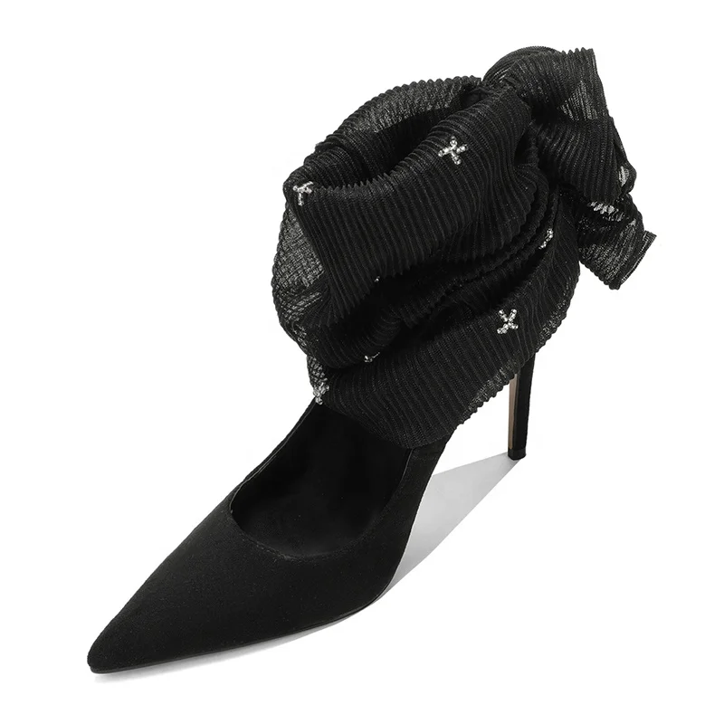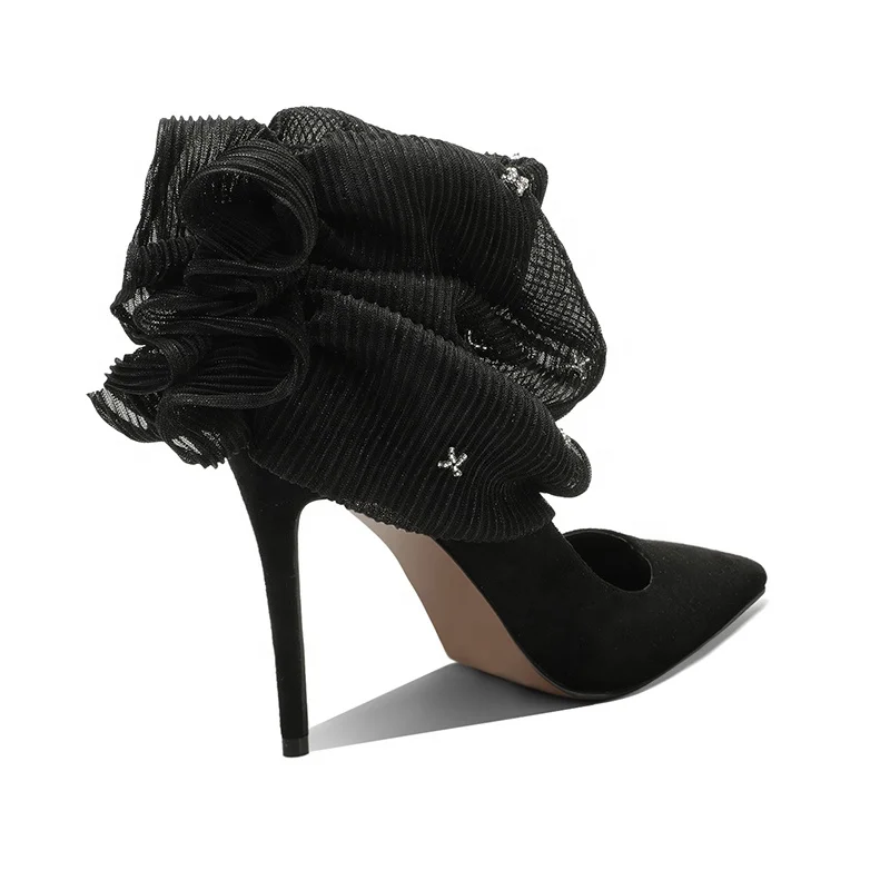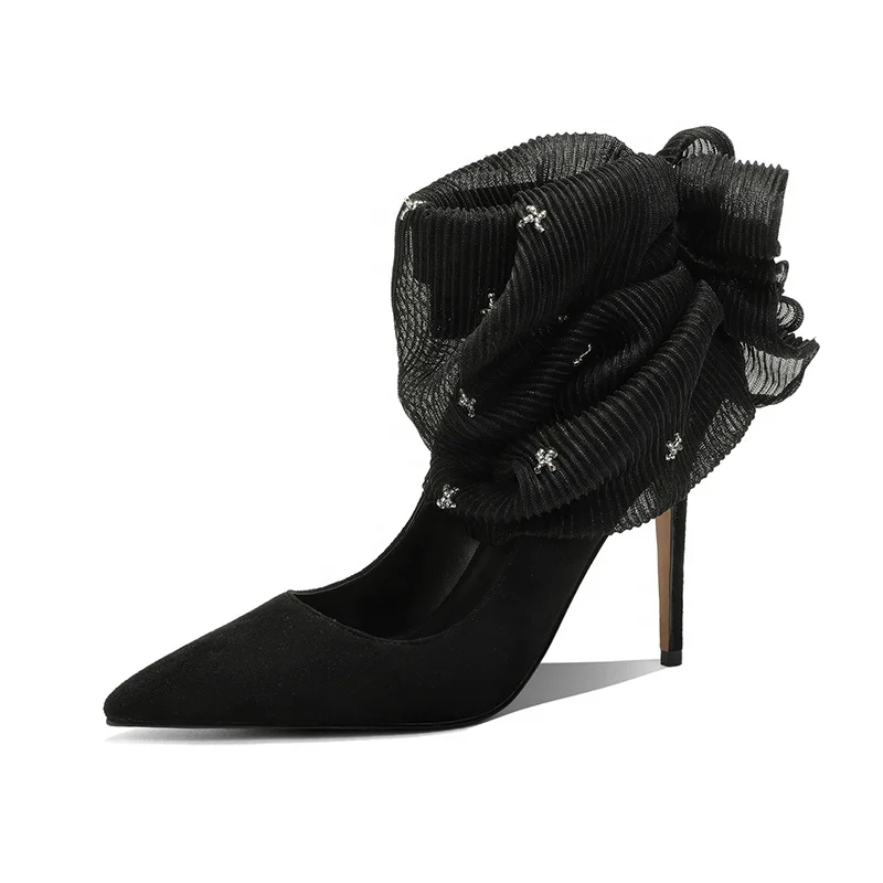 Custom Women's Formal Black Thin Heel Pumps Ruffled Organza Embellishment Slip-On Closure Rhinestone Summer Autumn