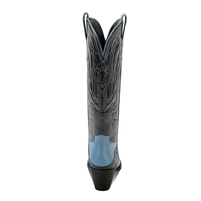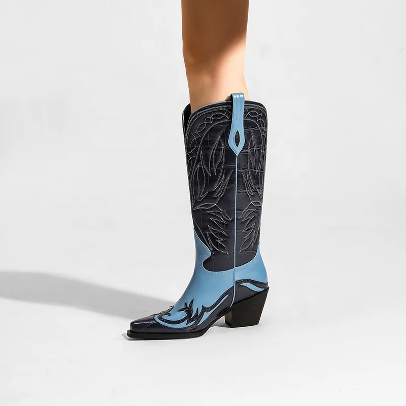 Two-Tone Blue & Black Western Cowboy Boots for Women Comfort Embroidered Pointed Toe Knee-High Boots with Block Heel