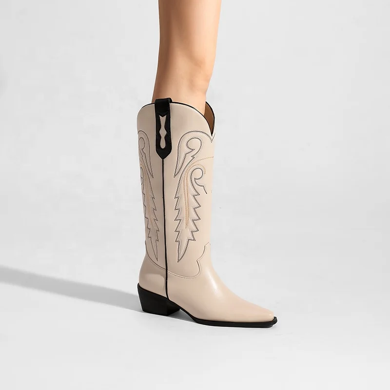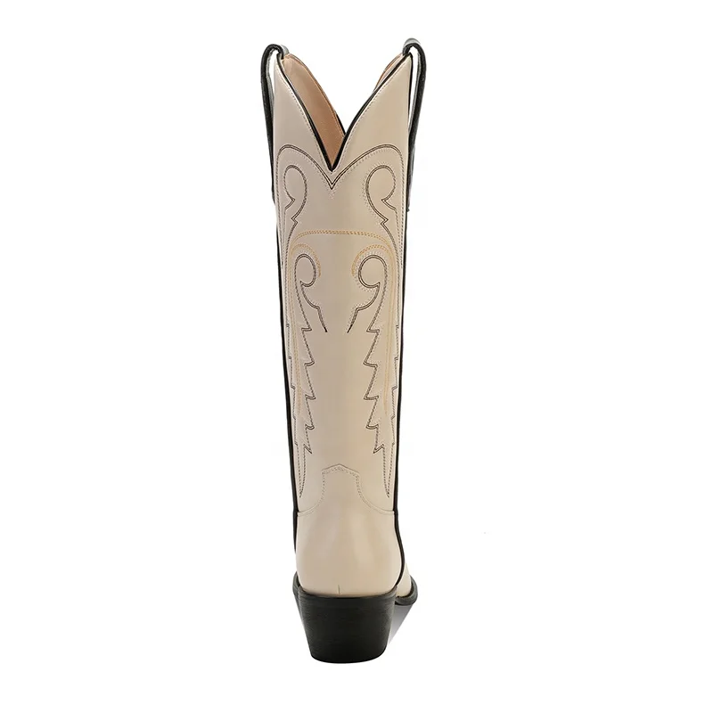 Cream Color White Western Knee High Boots with Embroidered Shaft and Black Contrast Trim Height Increasing Comfort Spring Boots