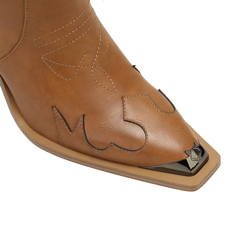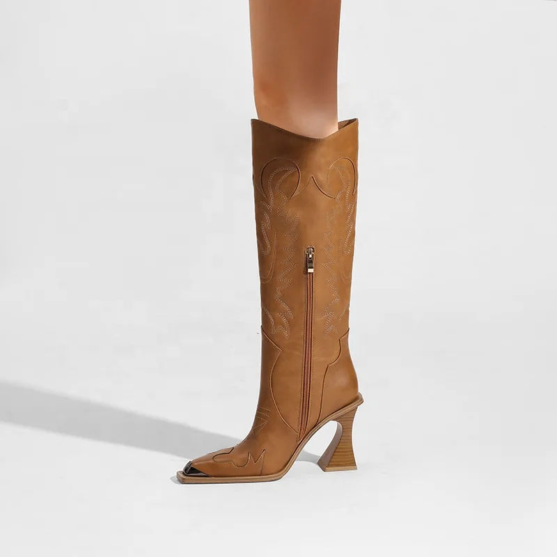 Autumn Spring Western Knee-High Boots for Women Custom Brown with Sculpted Heel Square Metal Toe Cap Height Increasing Feature