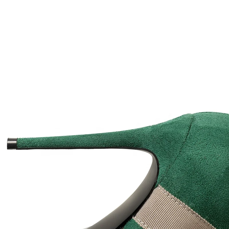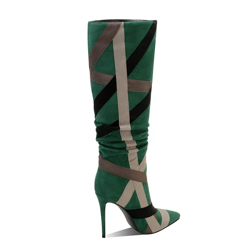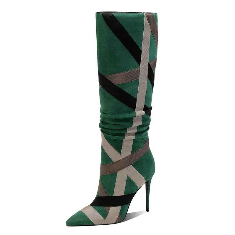 Custom Women's Green Suede Colorblock Fashion Boots Knee-High Stiletto Heel Height Increasing Western Boot for Autumn Winter