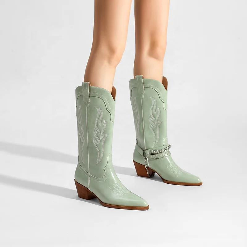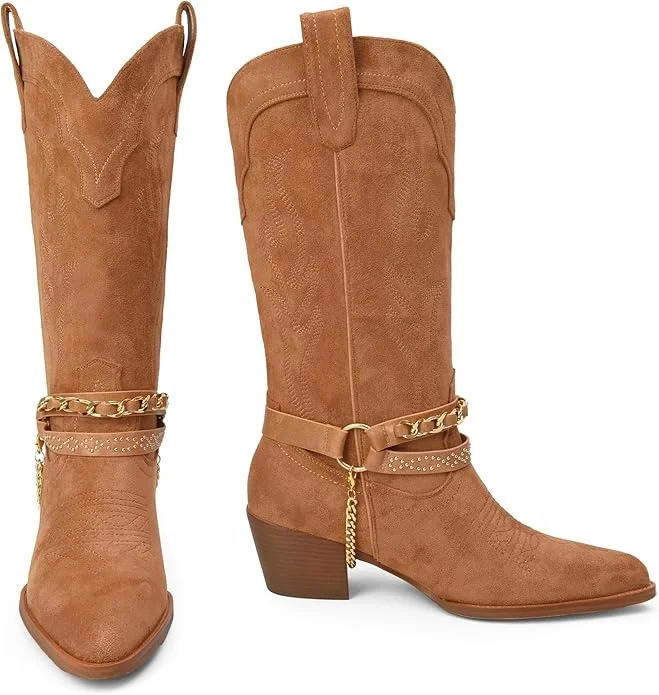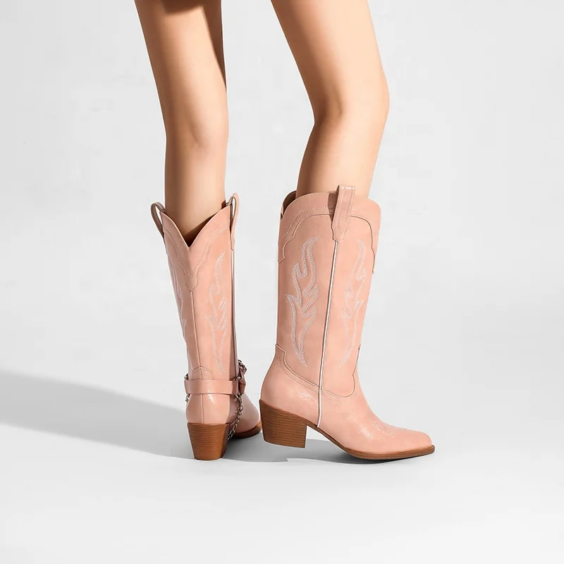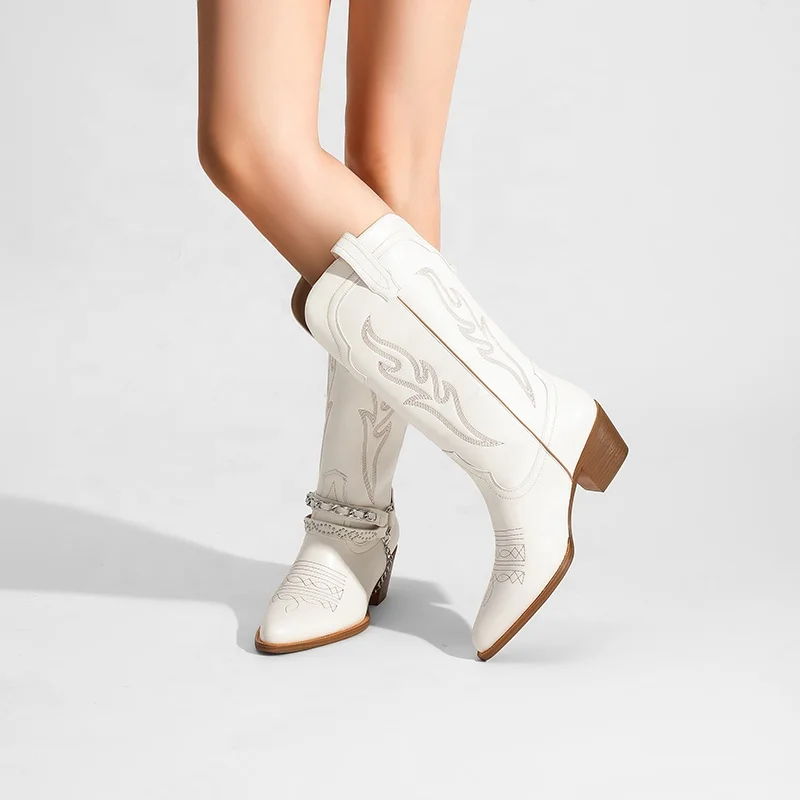OEM Custom Knee High Embroidered Cowboy Boots for Women Western Cowgirl Design Removable Chain Height Increasing Autumn Winter