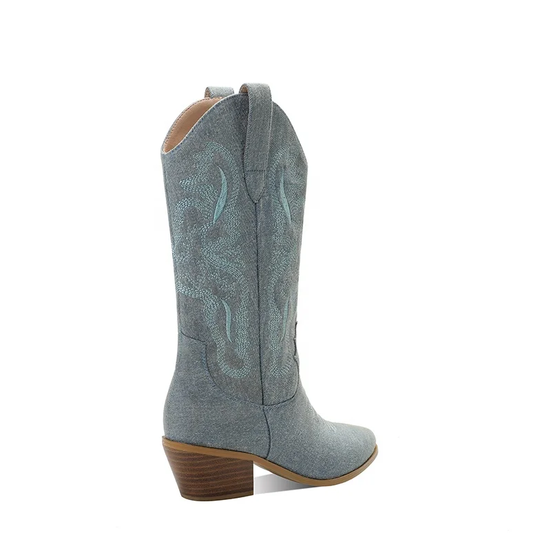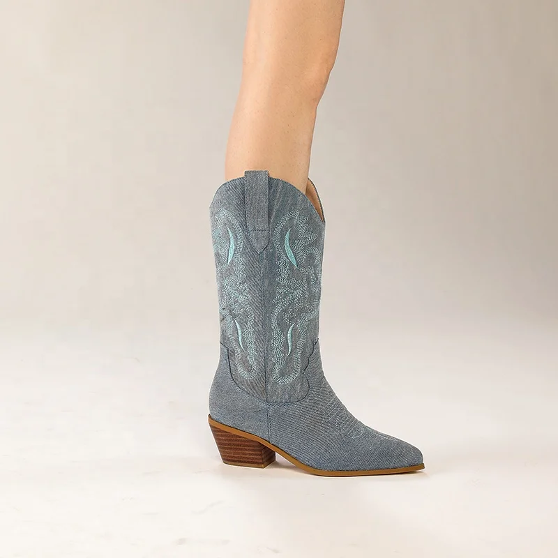 Women's Light Blue Denim Mid-Calf Block Heel Boots Embroidered Western Cowboy Style Comfortable for Summer Autumn Winter