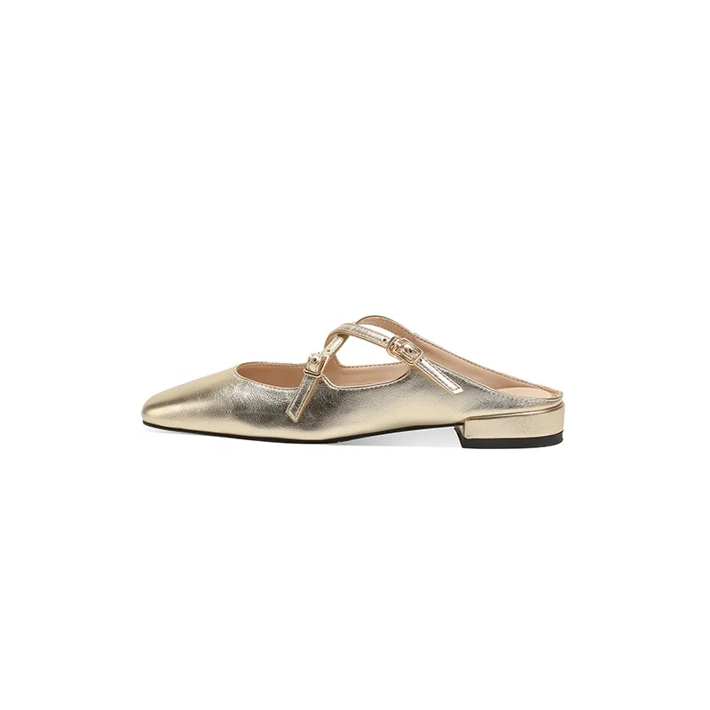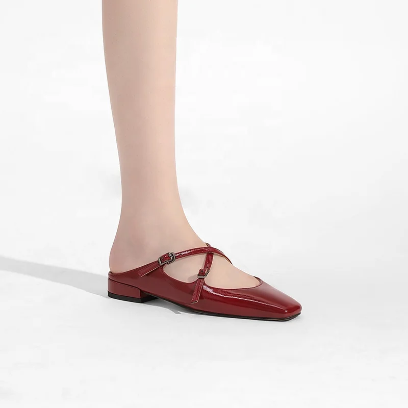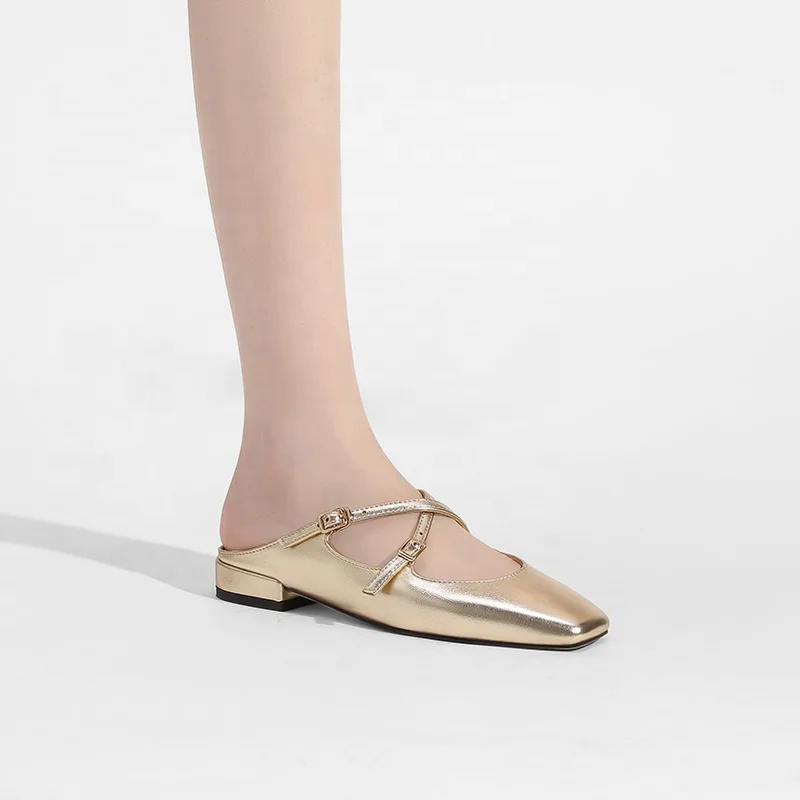 Elegant Women's Square Toe Criss-Cross Strap Backless Mules Flat Slide Loafers Mary Janes Fashion Trend Breathable Anti-Slip