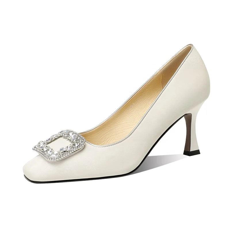 Elegant Square Toe Jeweled Buckle Pumps for Women Satin High Heels in Black White Customizable Woman Shoes