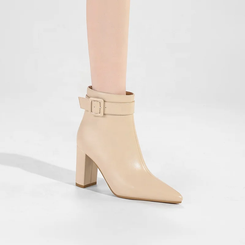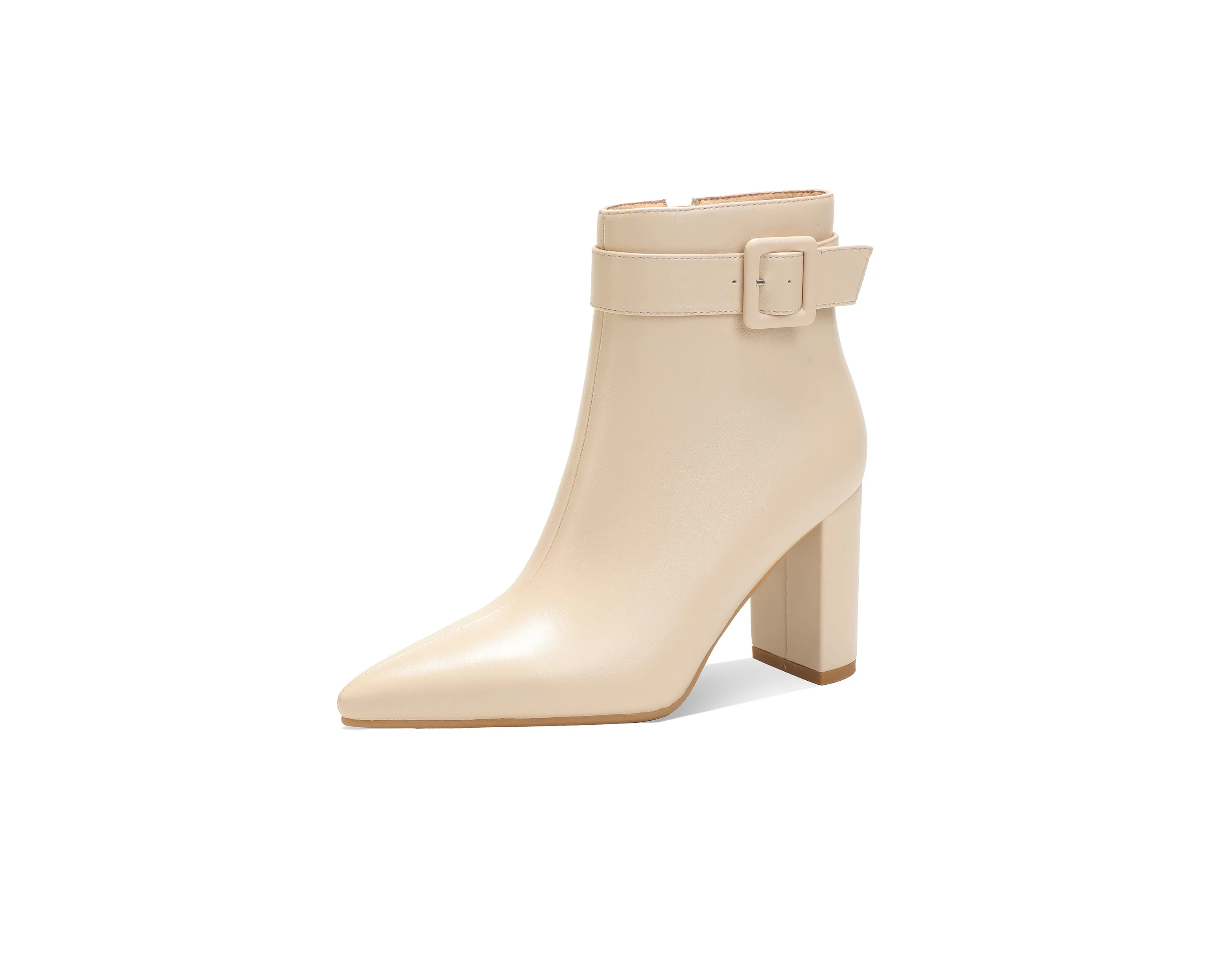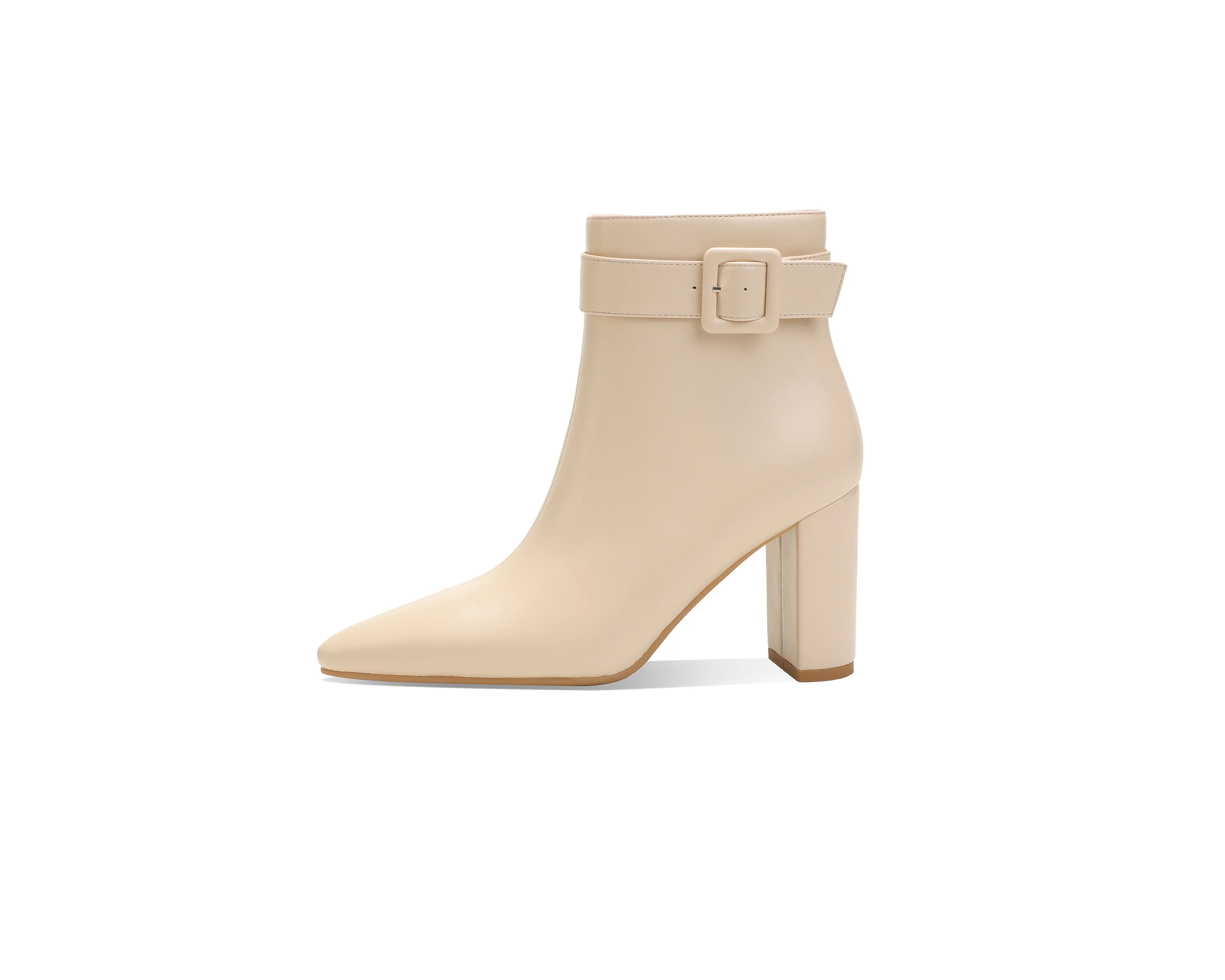 Women's Mid-Calf Block Heel PU Ankle Boots with Buckle Strap Pointed Toe Booties