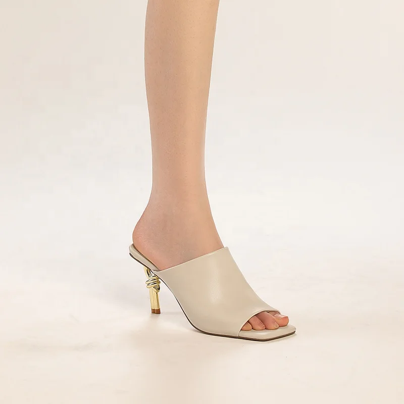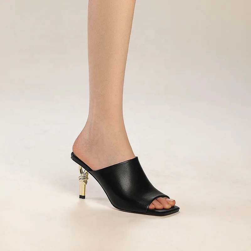 Elegant Women's Square Toe Knot Heel Mules Minimalist Slide Sandals with Gold Artistic Heel
