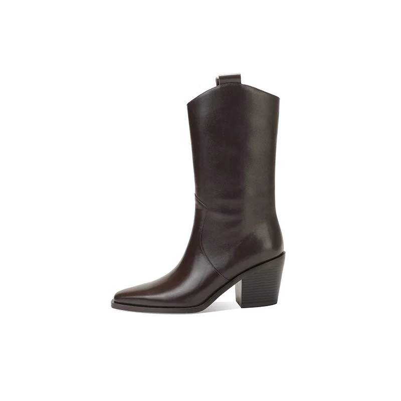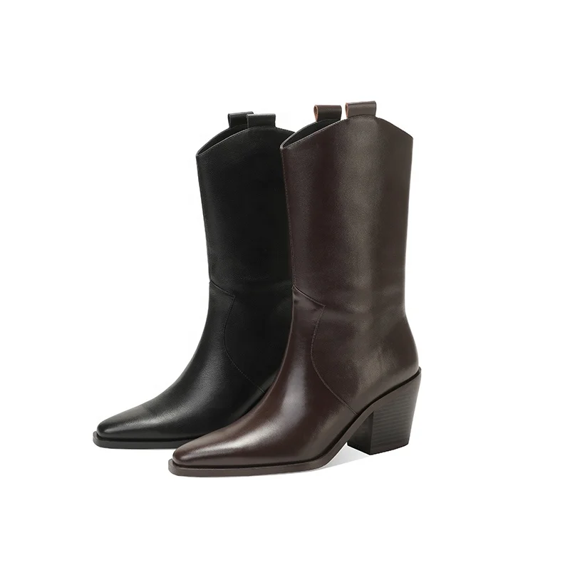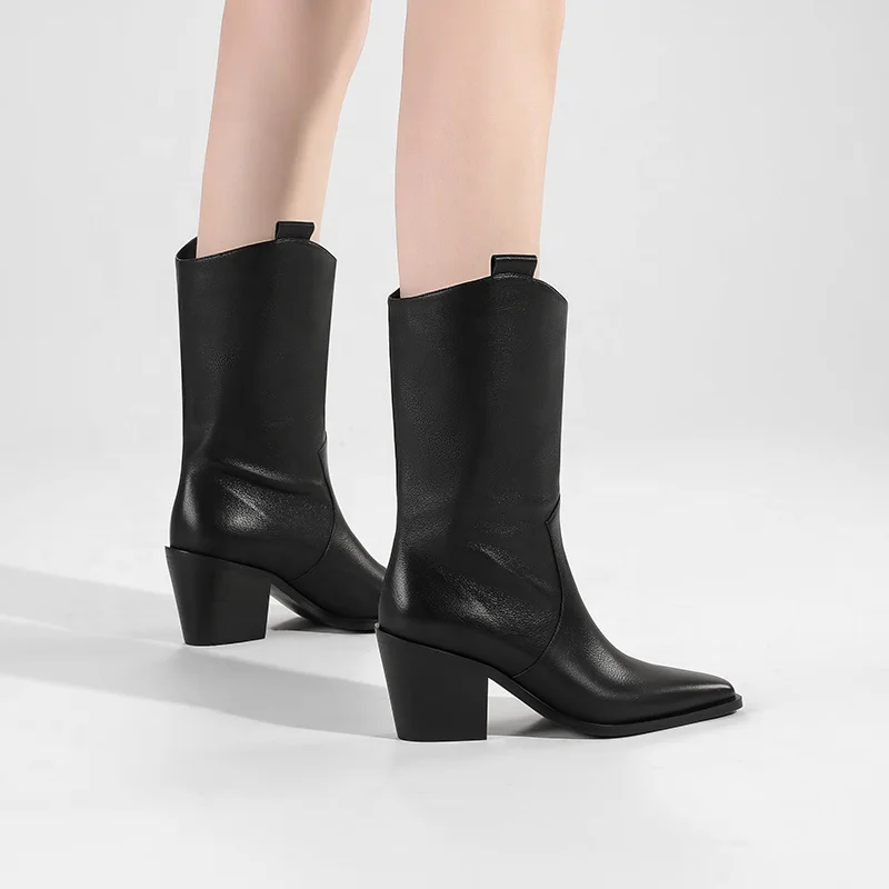 Women's Comfortable Mid-Calf Western Cowboy Boots Pointed Toe Chunky Heel Height Increasing Genuine Leather