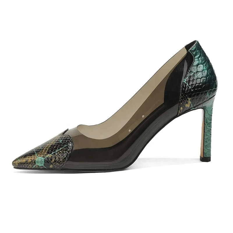 Custom Clear PVC PU Thin Heels Women Snake Print Pattern Pointed Toe Slip-On Comfortable Fashionable Office Shoes Flexible 8.5cm
