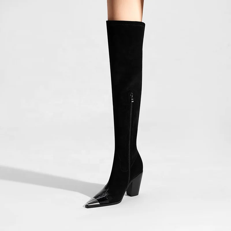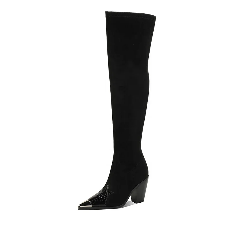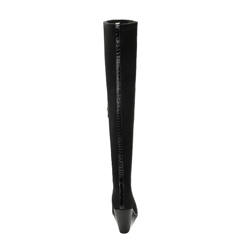 Moncheer Women's Black Faux Suede Knee-High Boots Croc Embossed Western Block Heel Thigh High Cowboy Boots with Winter Style