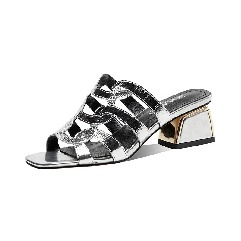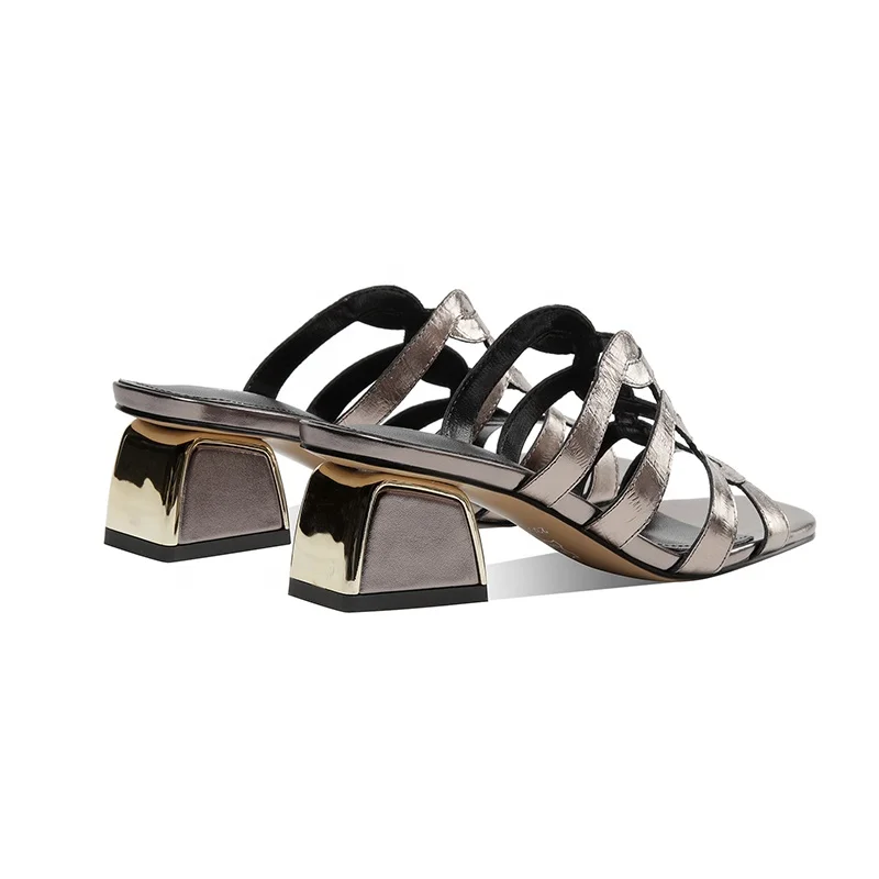 Moncheer Women's Trendy Block Heel Slip-On Shoes OEM Summer Sexy Open Weave Slide Sandals with Metallic Square Toe Chunky Heel