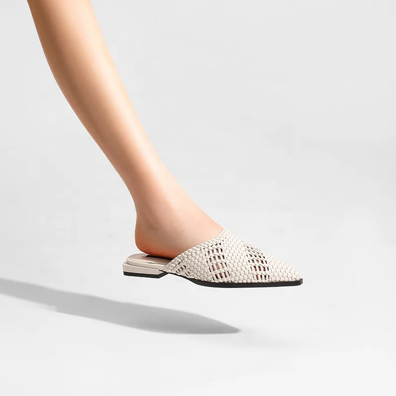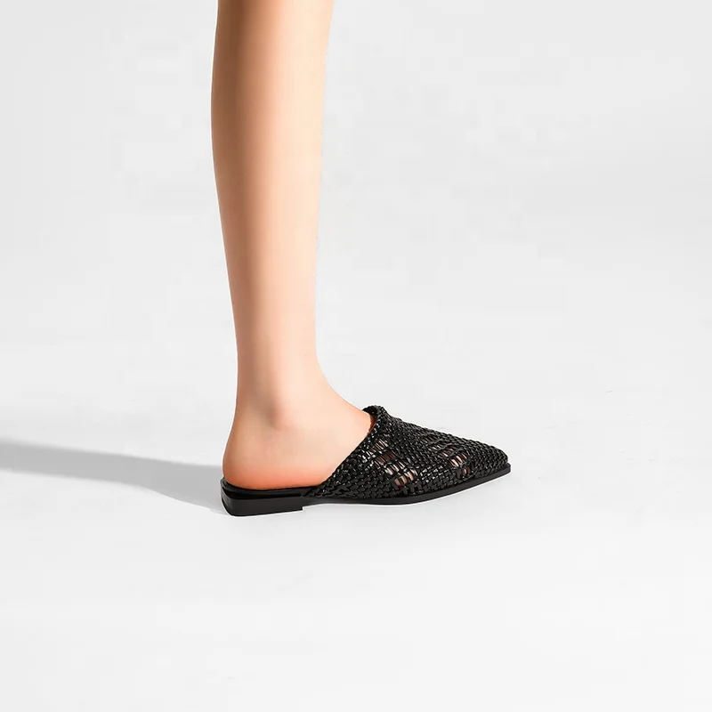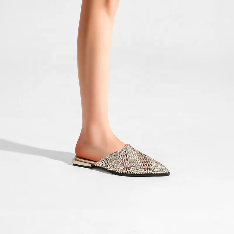 Moncheer Women's Open Toe Woven Summer Flat Mules Breathable Metallic & Matte Weave Slip-On Sandals for Spring