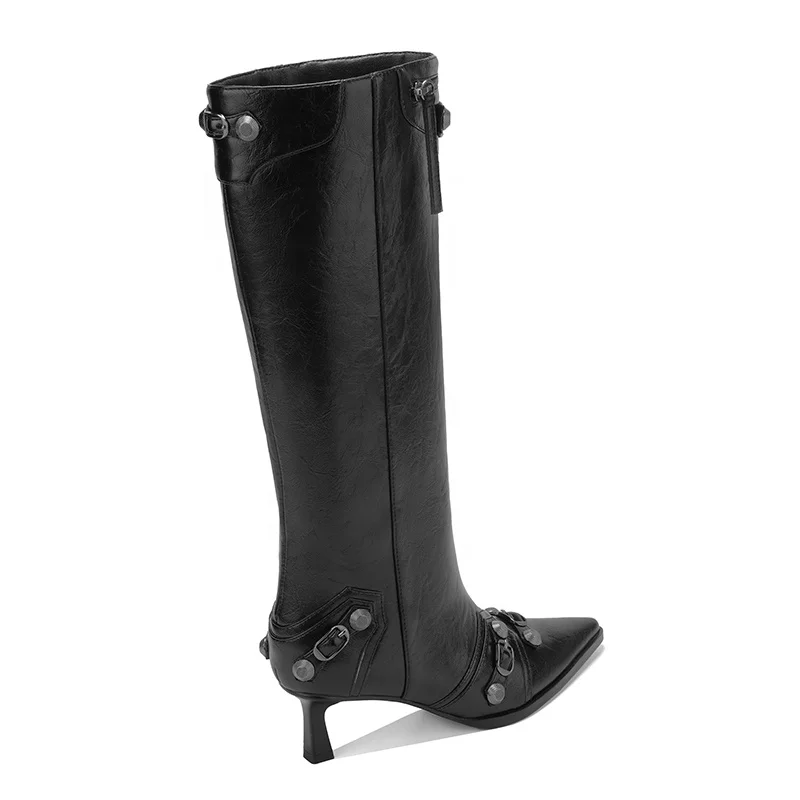 Women's Mid Heel Knee-High Leather Boots Black Pointed Toe Design Buckle Rivet Detail Winter Western Height Increasing OEM ODM