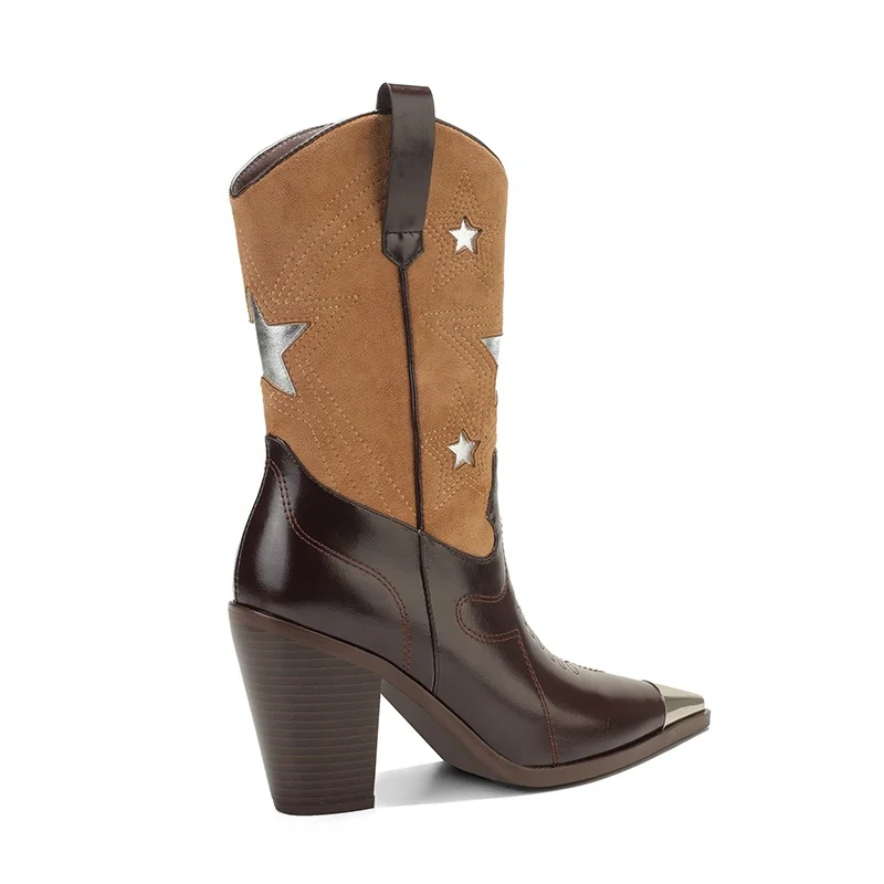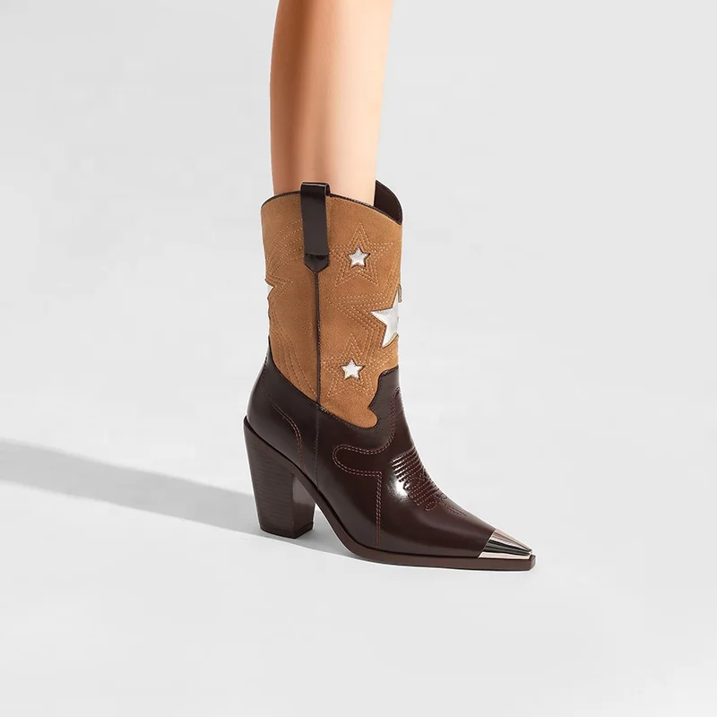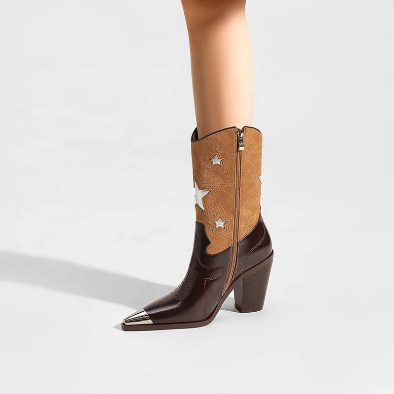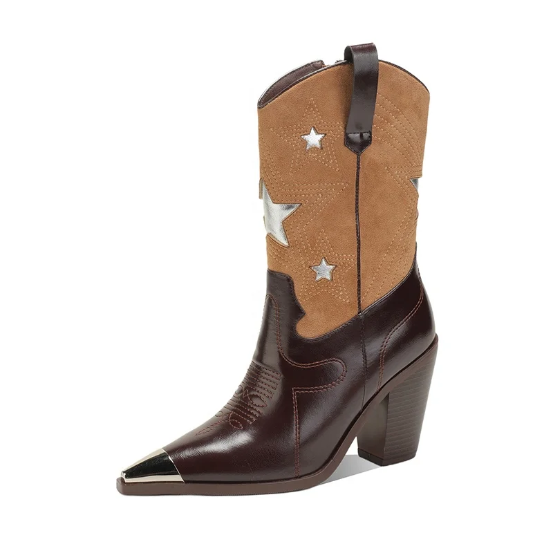 Moncheer Two-Tone Western Boots Star Embroidery Pointed Toe Chunky Heel Waterproof Comfortable Zip Cowboy Winter Autumn Summer