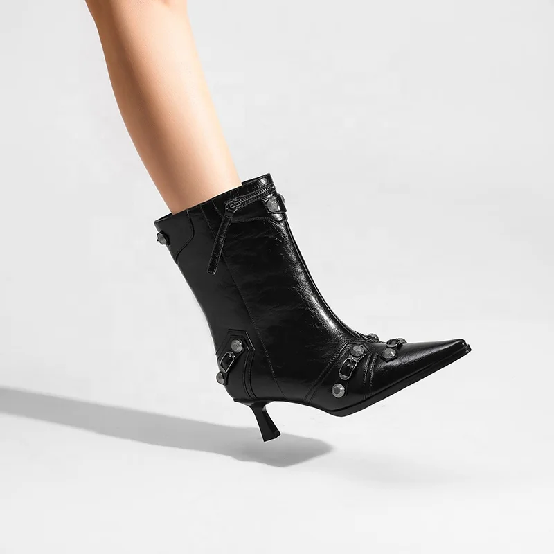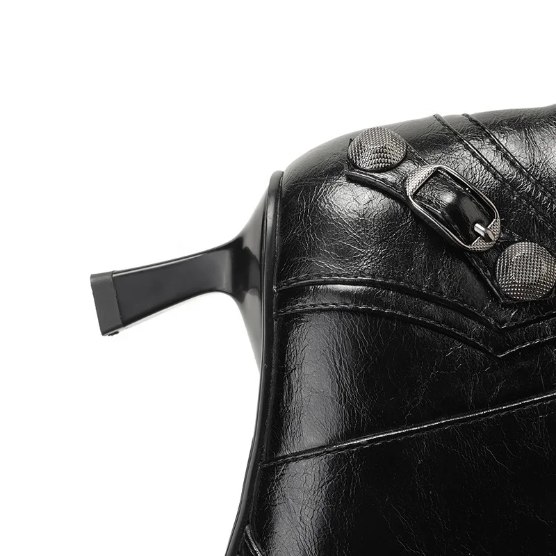 Moncheer Custom Women's Black Western Winter Pointed Toe Mid-Calf Boots with Metal Studs and Buckle Detail OEM ODM Available