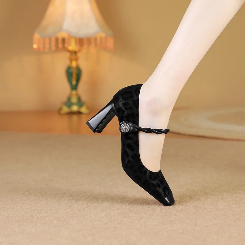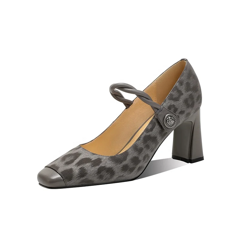 Moncheer Custom Leopard Print Mary Jane Pumps Chunky Heel with Twisted Strap and Decorative Button Comfortable and Breathable