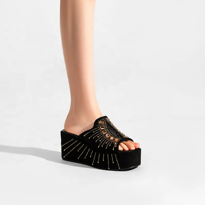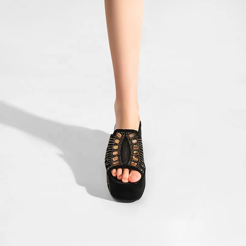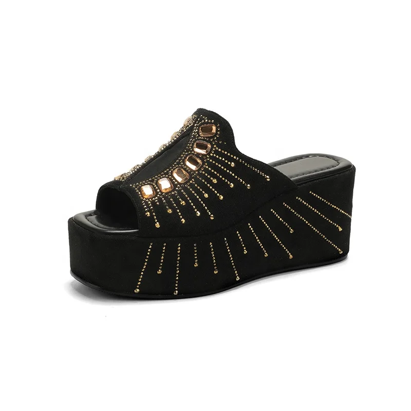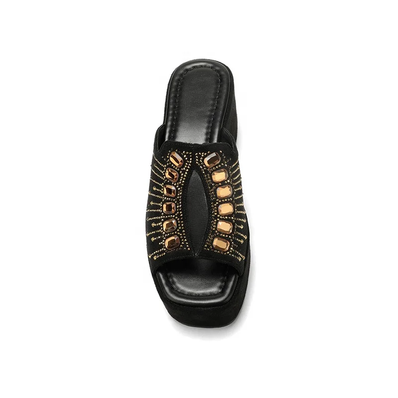 Moncheer Custom Women's Summer Outdoor Anti-Slip Open Toe Slide Mules Black Wedge Platform Gold Rhinestone Embellishment Slip-On
