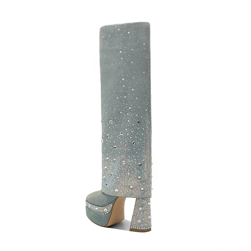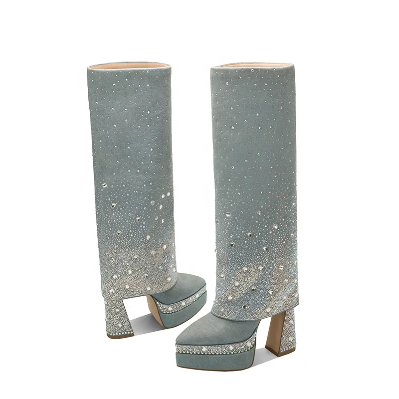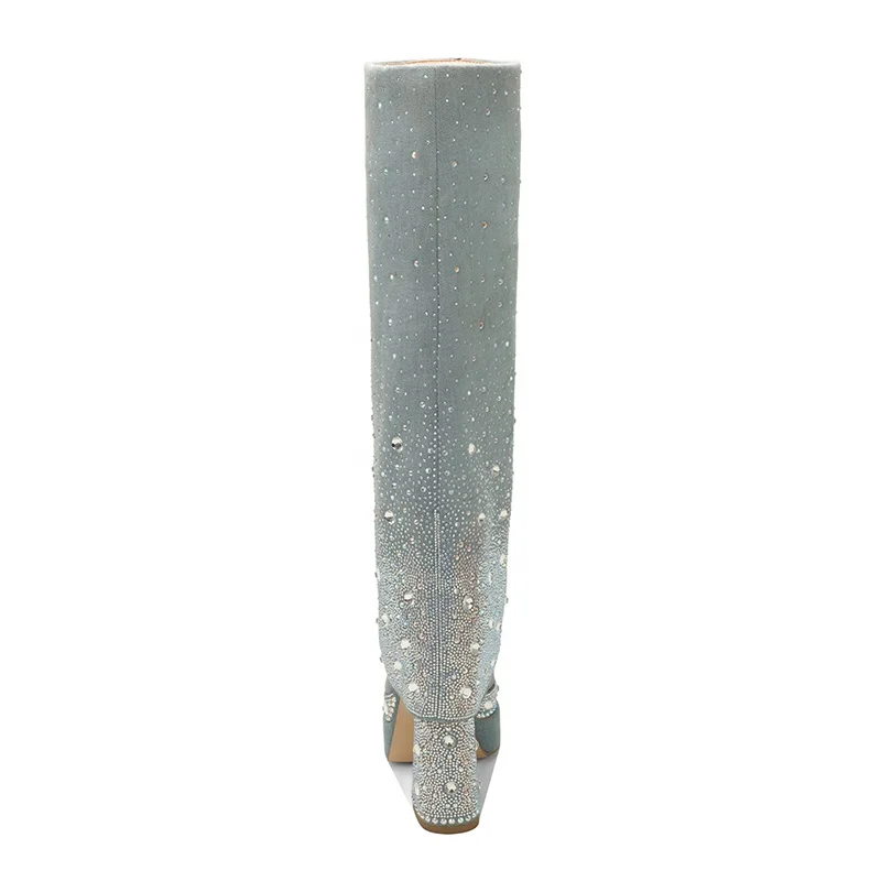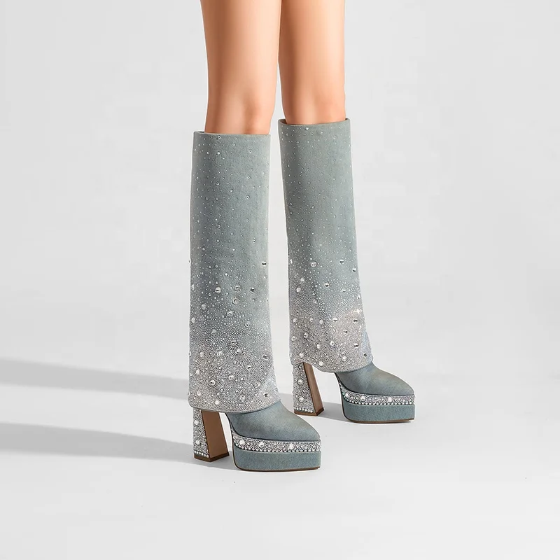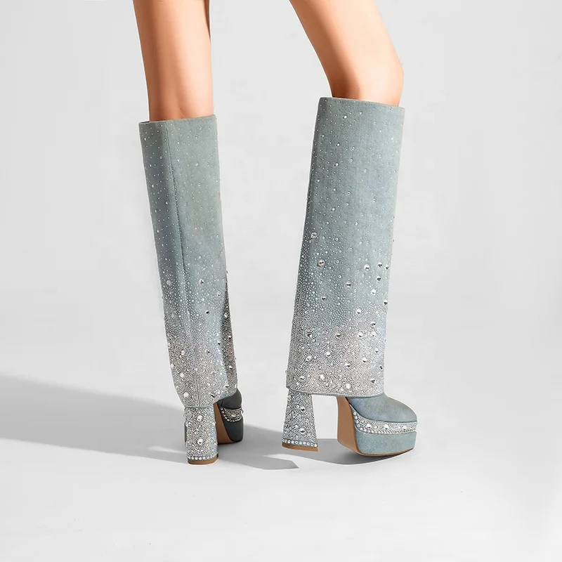 Moncheer Women's Western Pointed Toe Custom Blue Denim Platform Knee-High Boots Rhinestone Embellishment Summer/Winter Anti-Slip