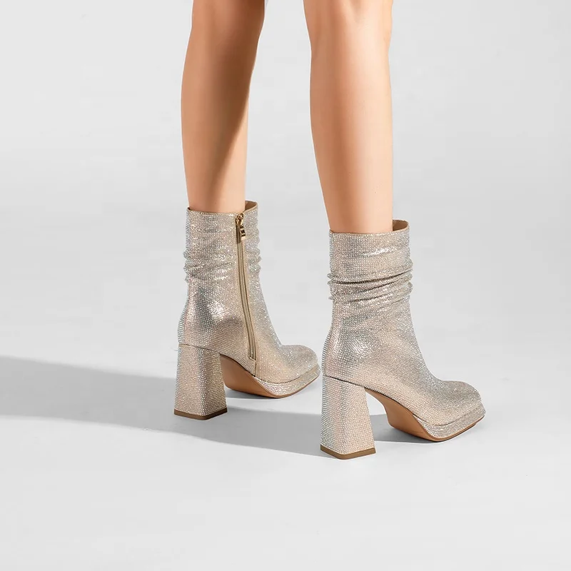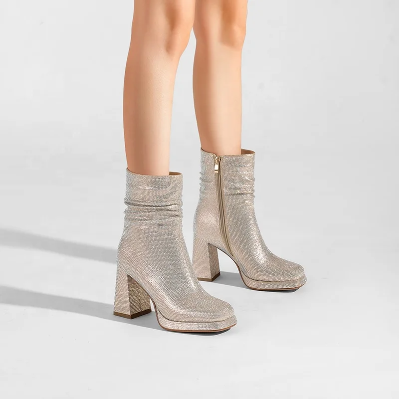 Moncheer Women's Glitter Block Heel Ankle Boots Super Shinny Square Toe Party Boots Platform Western Style Sparkly Rhinestone