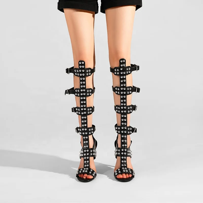 Moncheer Women's Sexy Gladiator Knee High Stiletto Sandals Open Toe Heels Studded Buckle Straps Anti-Slip Barefoot Dance Shoes