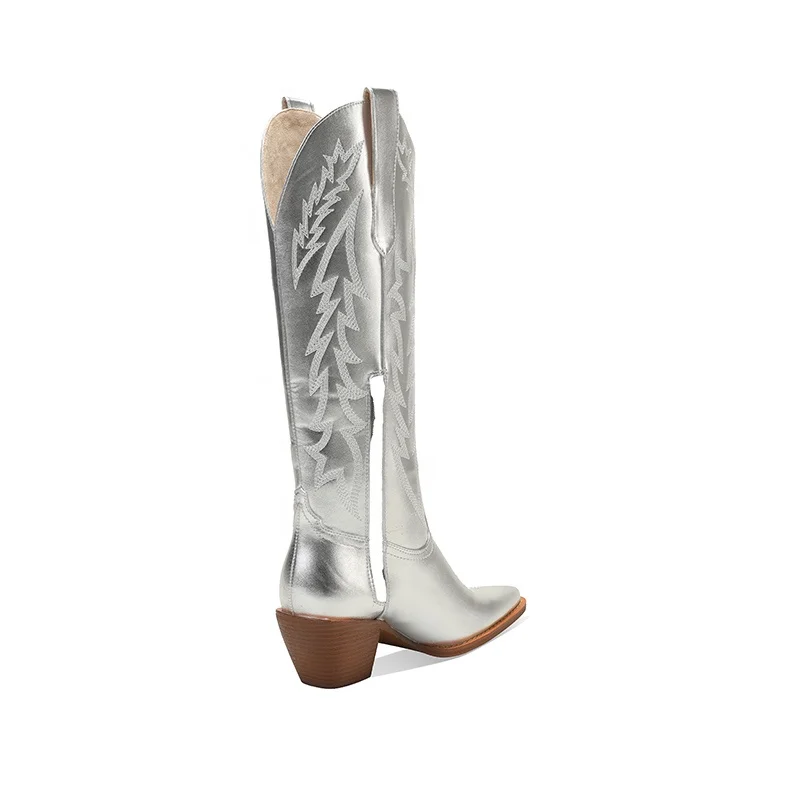 Women's Metallic Silver Cowboy Boots Pointed Toe Western PU Leather Embroidered Knee-High Booties with Low Heel