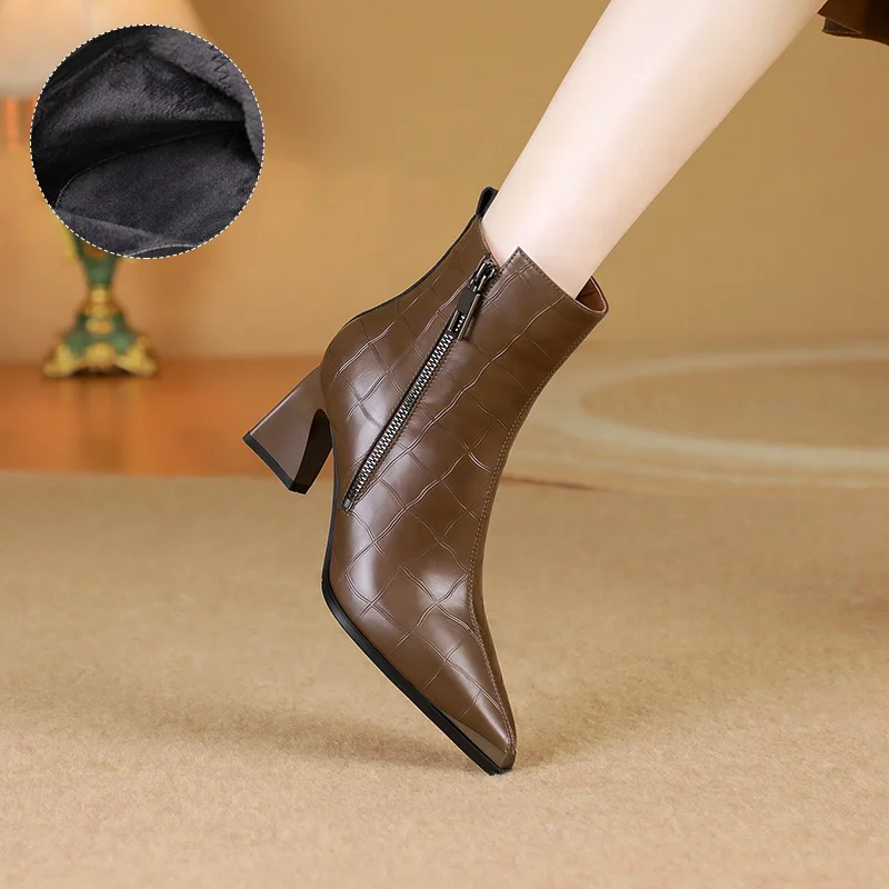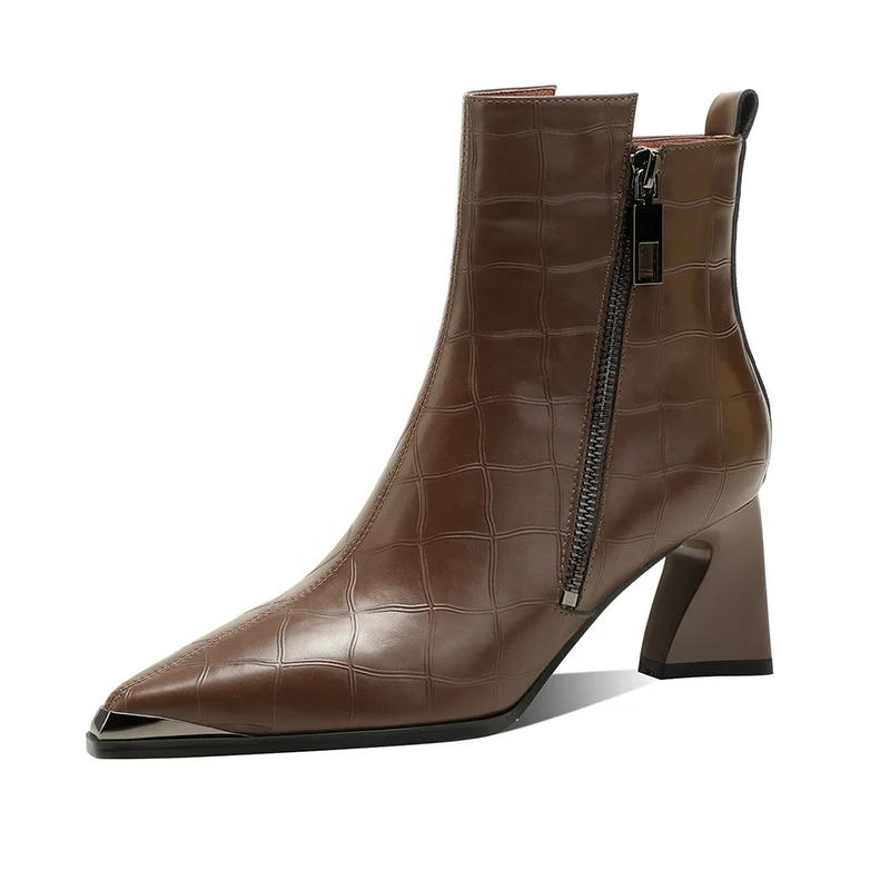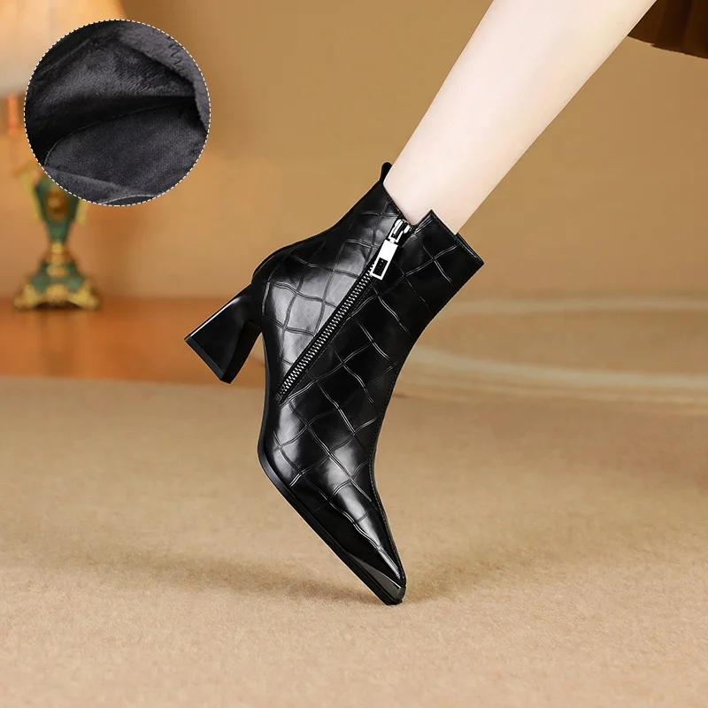 Moncheer Women's for Crocodile Pattern Mid Block Heel Ankle Boots Formal Western Style Pointed Toe Square Heel Side High Quality