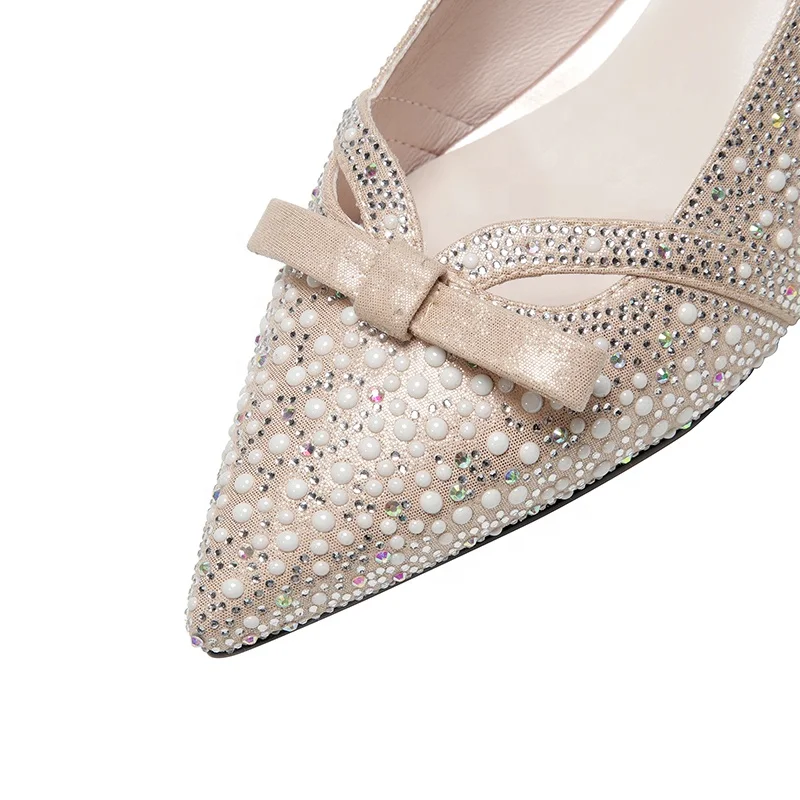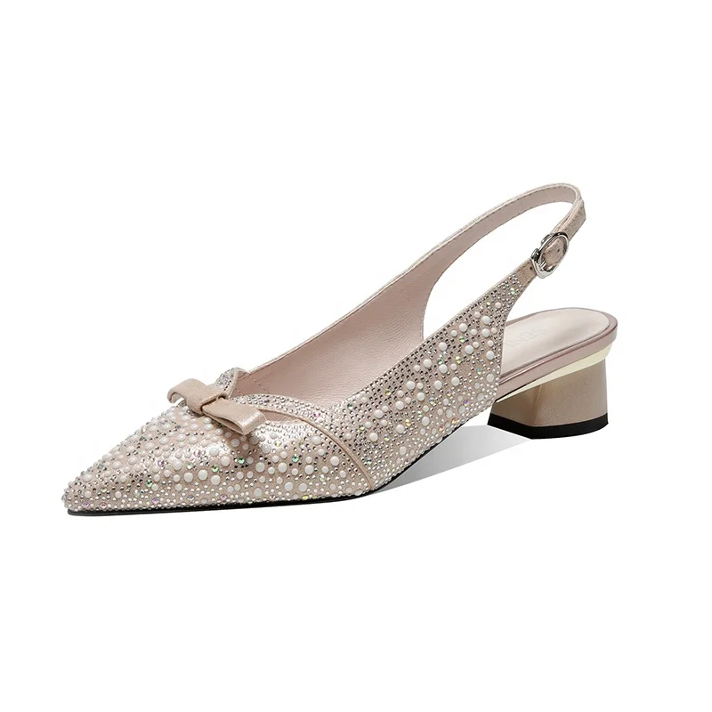 Moncheer Women's Rhinestone Pearl Slingback Pumps Pointed Toe Low Heel Light Weight Slip-On Dress Shoes Bow Sexy Winter Summer