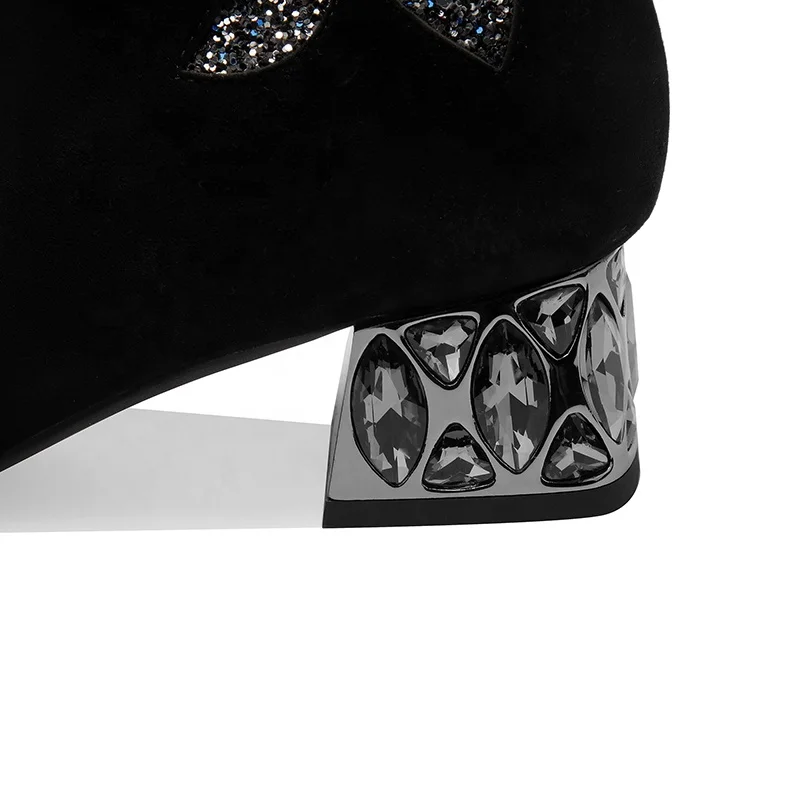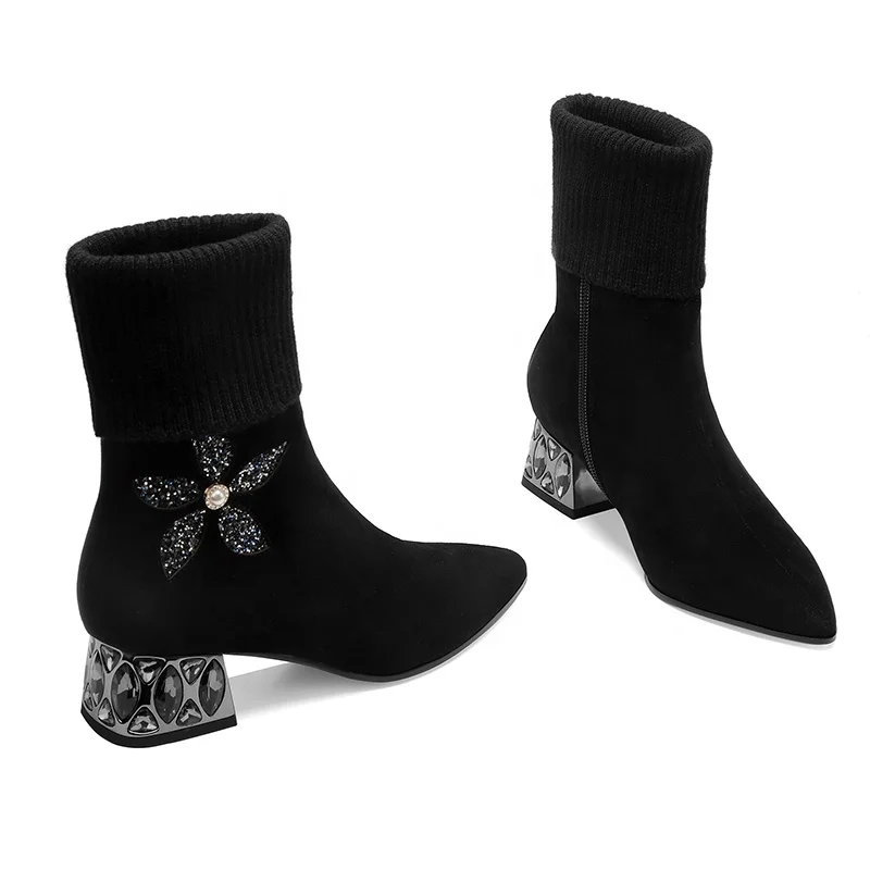 Moncheer Women's Knitted Shaft Ankle Boots Suede Flower Crystal Heel Booties for Fall & Winter Wholesale OEM ODM