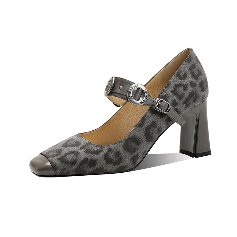 Moncheer Custom Women's Black and Grey Leopard Print Chunky Heel Mary Jane Pumps with Round Buckle Strap Comfort Fashion Trend