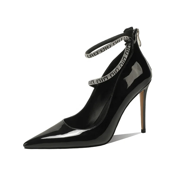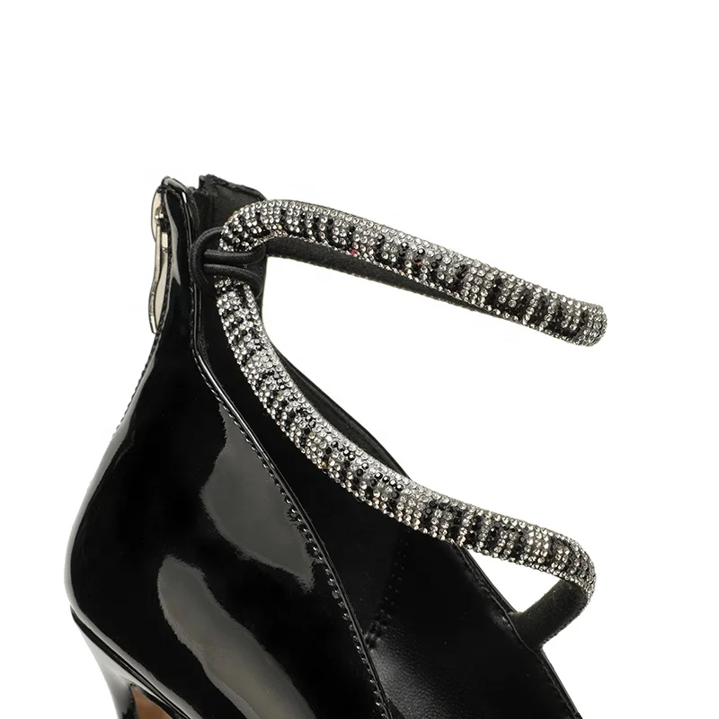Moncheer Women's Rhinestone Double-Strap Black Glossy Stiletto Heels Pointed Toe Evening Pumps