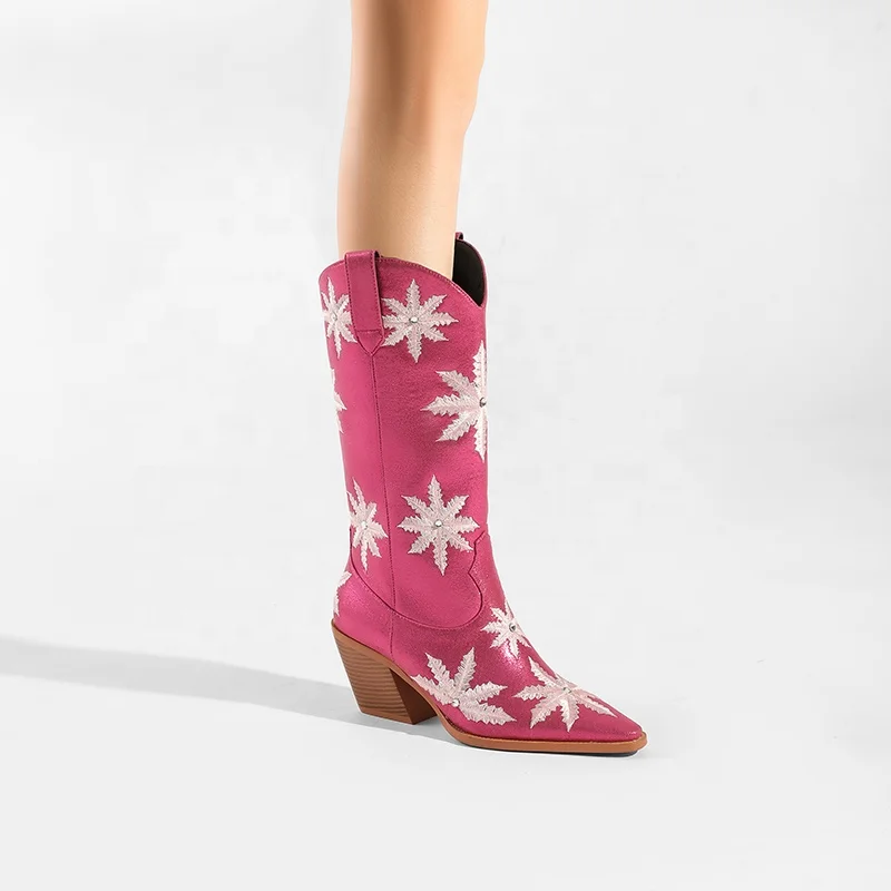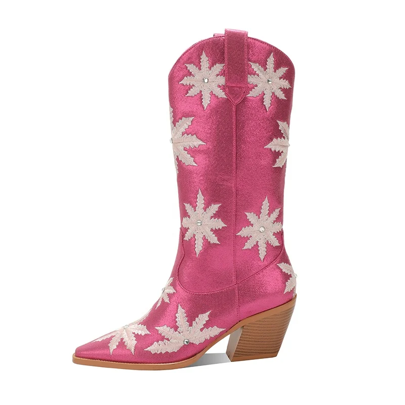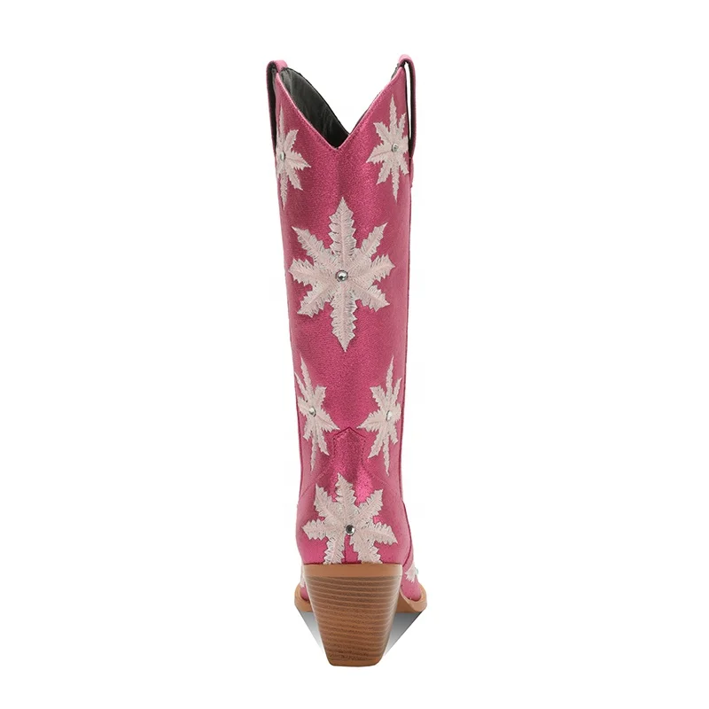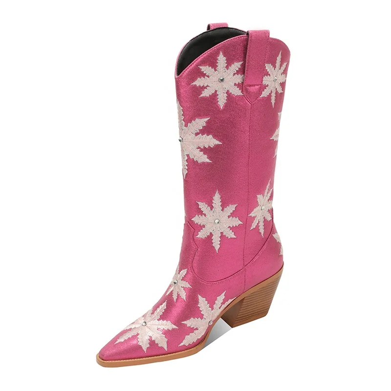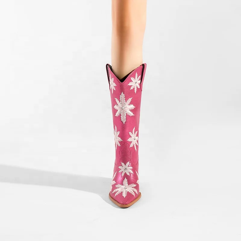 Women's Pink Star Embroidered Western Cowboy Boots Square Toe, Chunky Block Heel