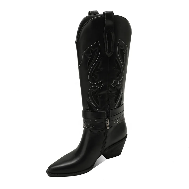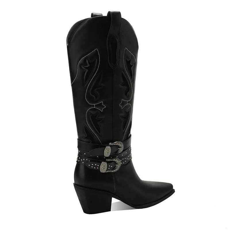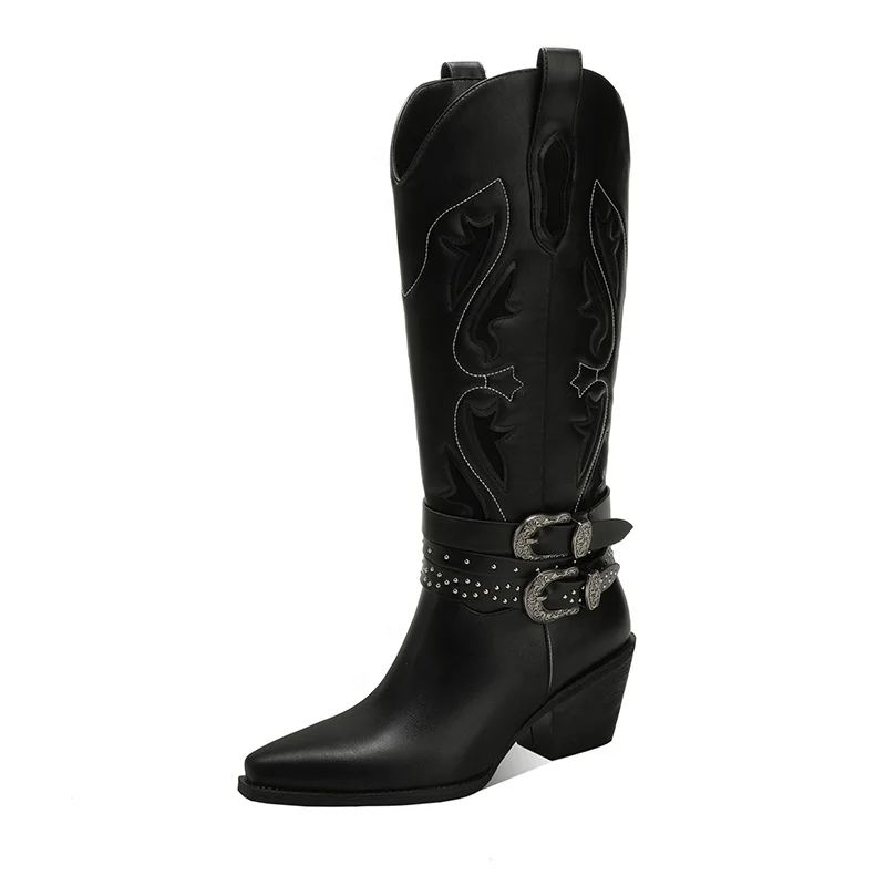 Moncheer Women's Western Cowboy Boots with Double Buckle Straps Black Embroidered Knee-High Boots