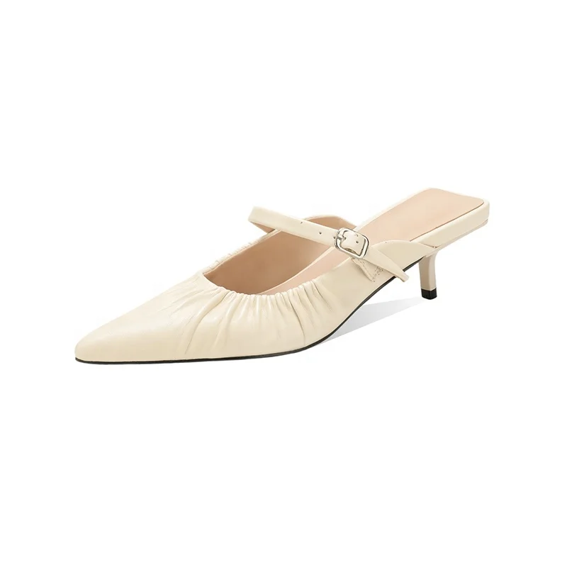 Moncheer Women's Pointed Toe Ruched Mules with Adjustable Strap Kitten Heel Slip-On Dress Shoes